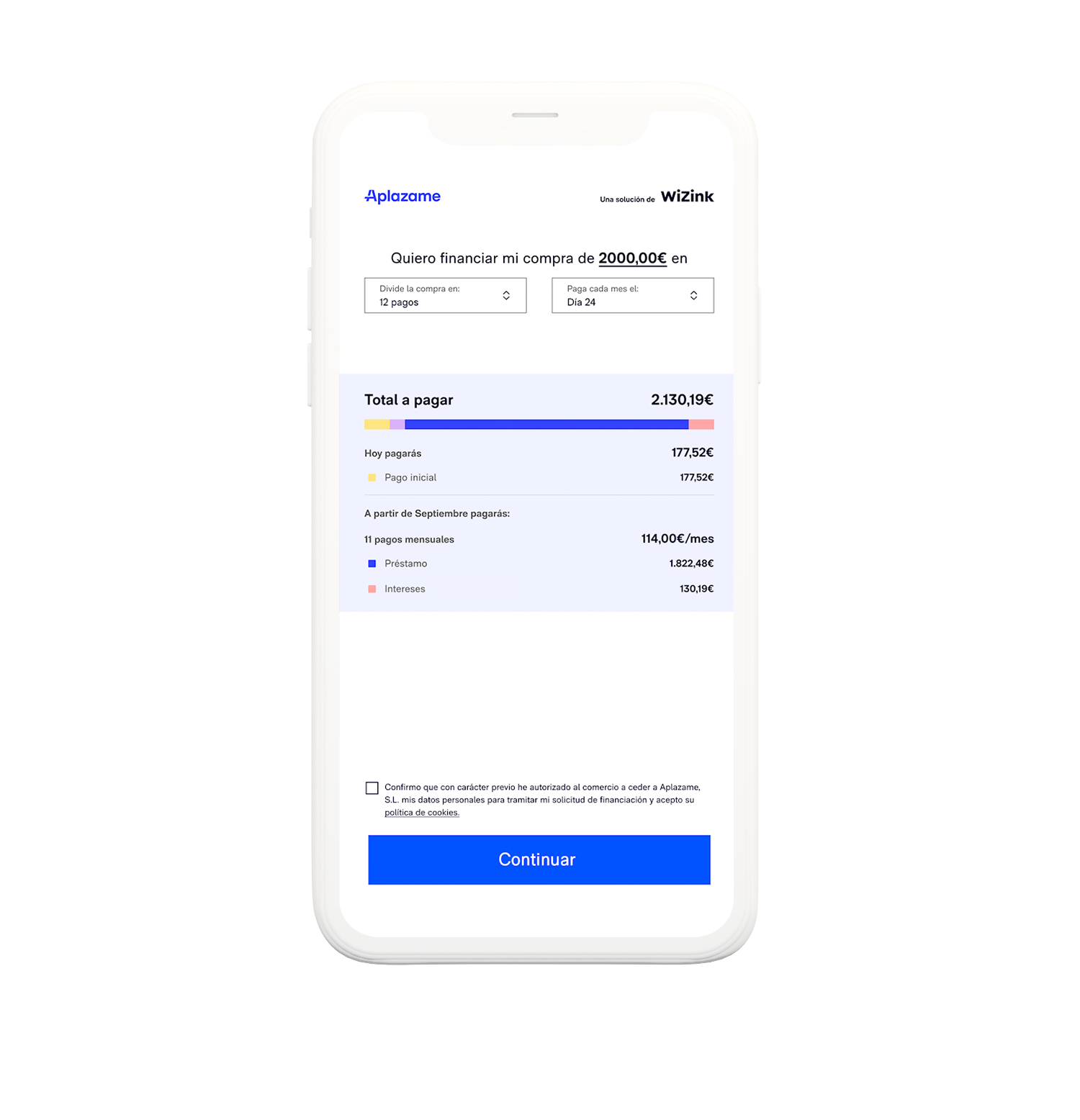 Deja de preocuparte por la letra pequeña. No hay. Lo único que vas a pagar es lo que verás durante el proceso de compra. Ni un céntimo más. Te da hasta 2.500€ para comprar lo que necesites y los devuelves hasta en X meses.