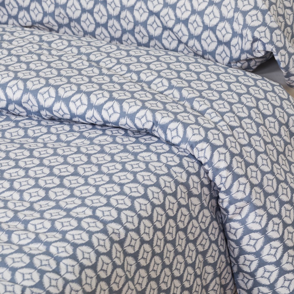 Funda de almohada y funda nórdica con estampado geométrico de color blanco sobre un fondo azul.