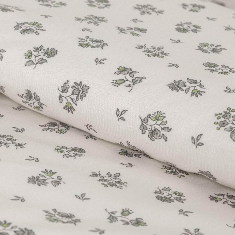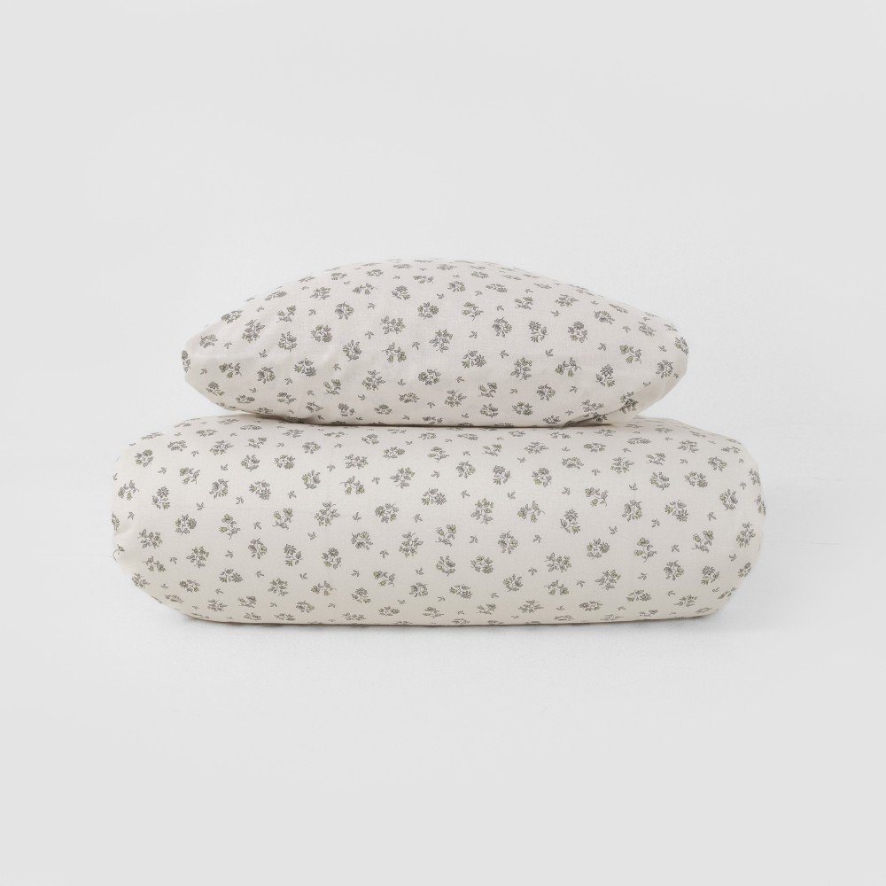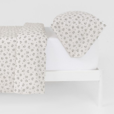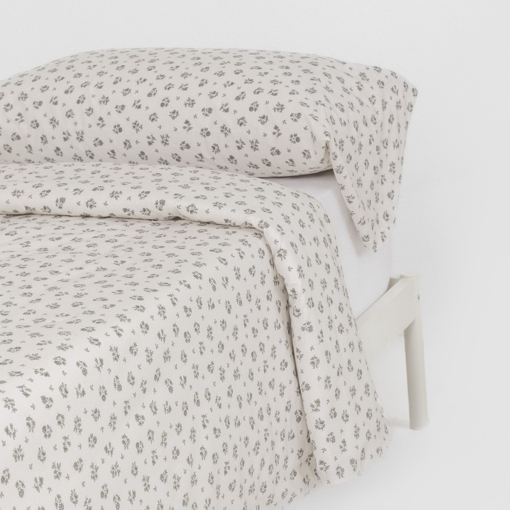 Funda de almohada y funda nórdica con un estampado discreto de flores verdes sobre un fondo blanco.