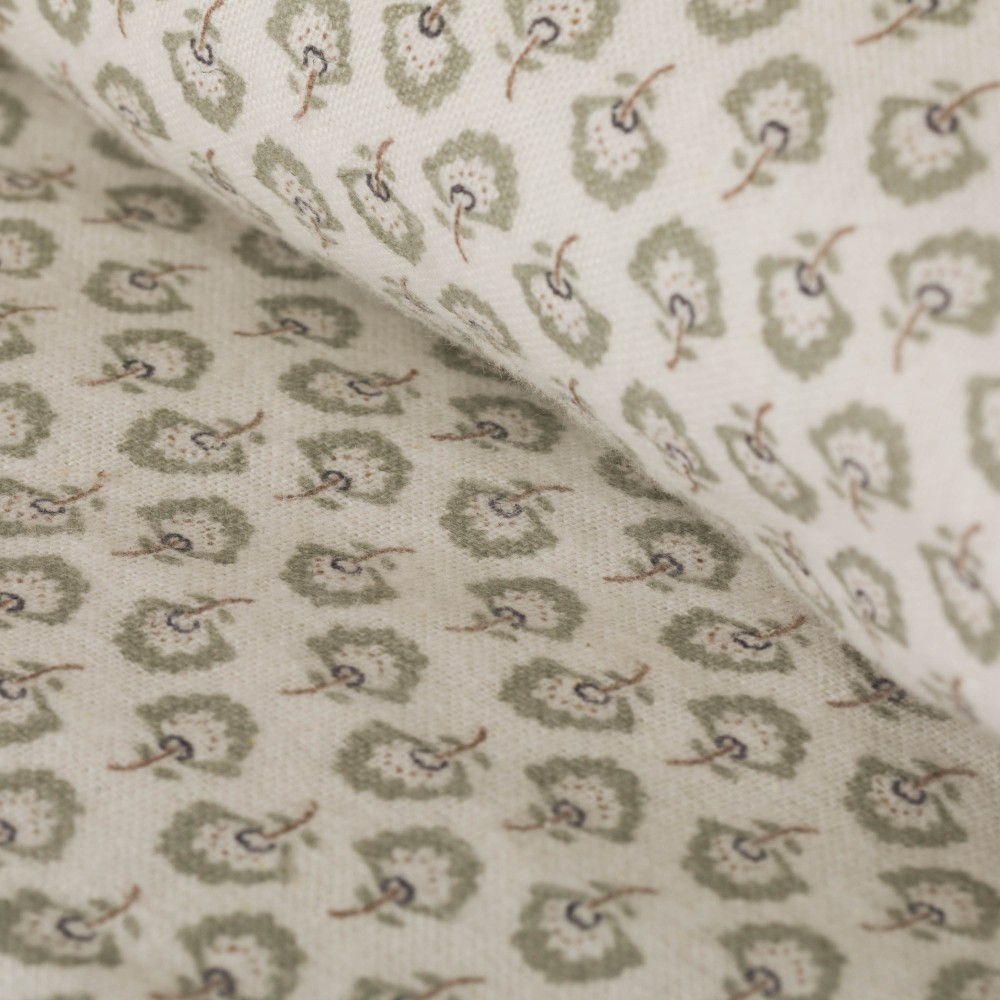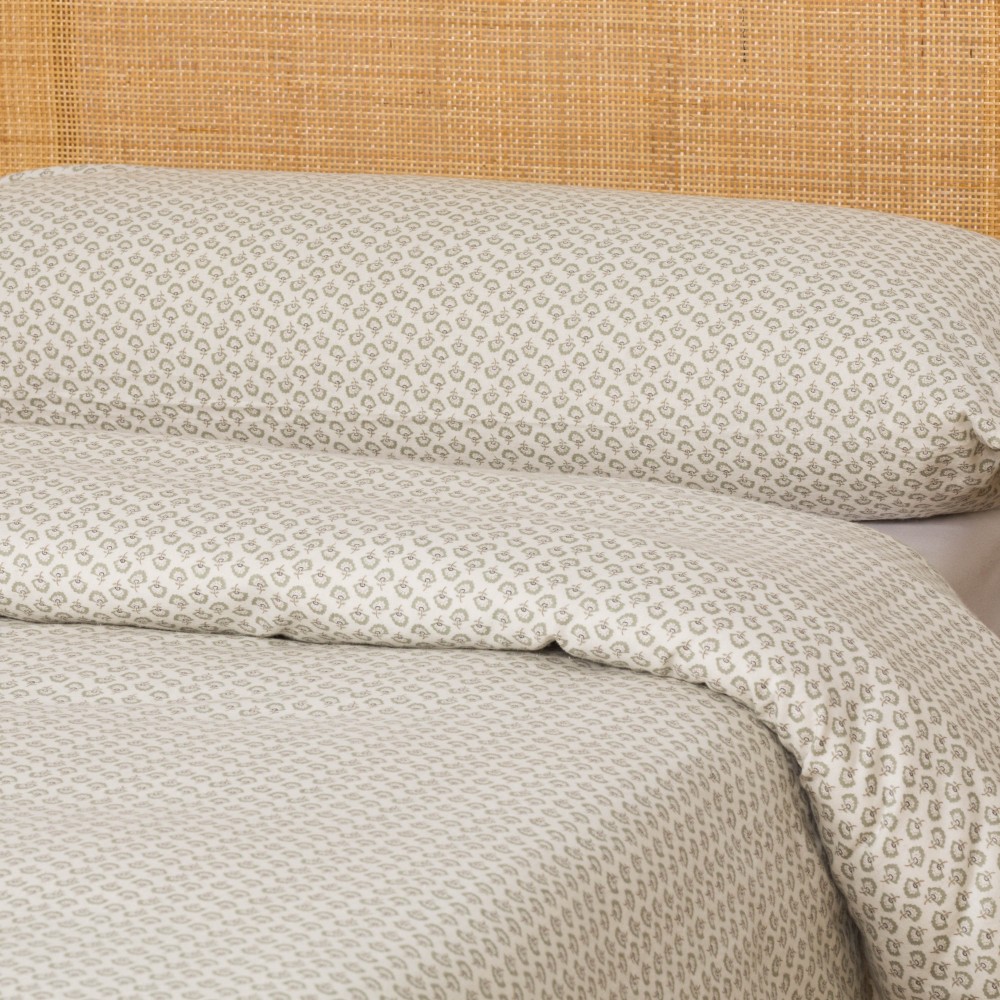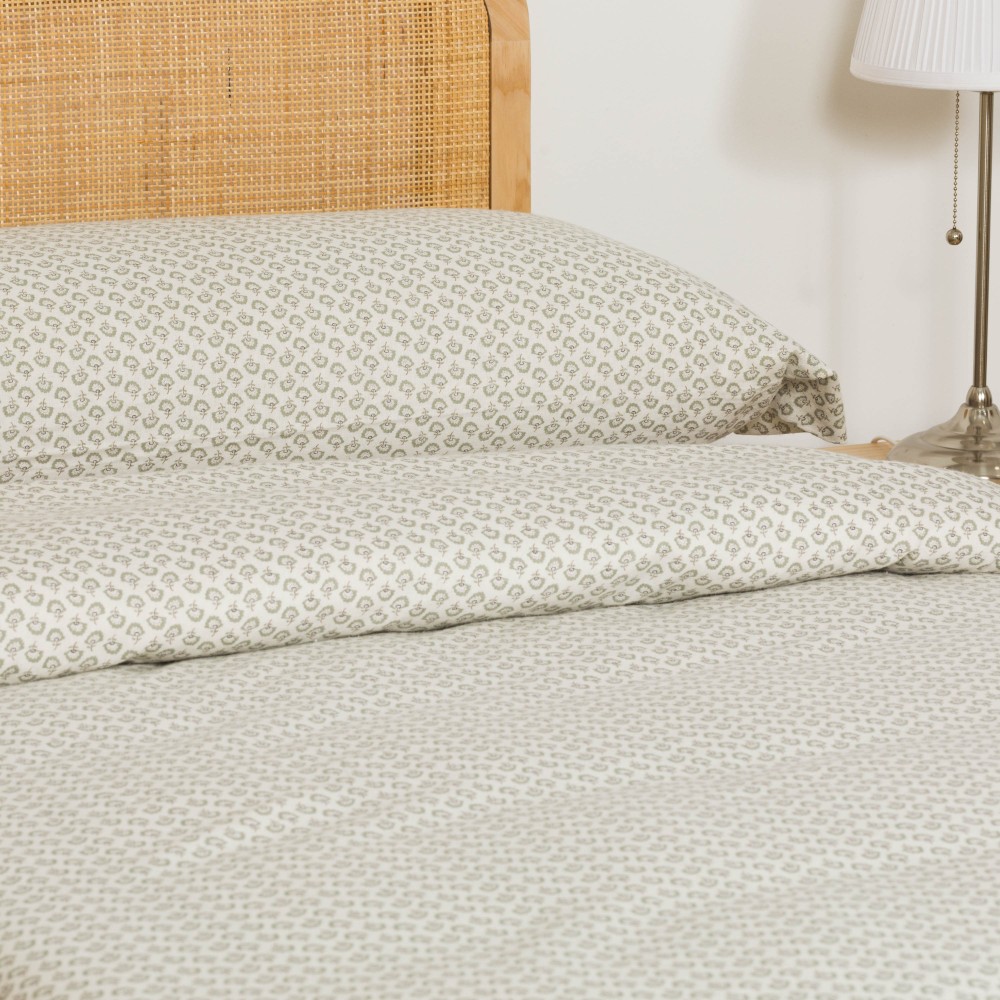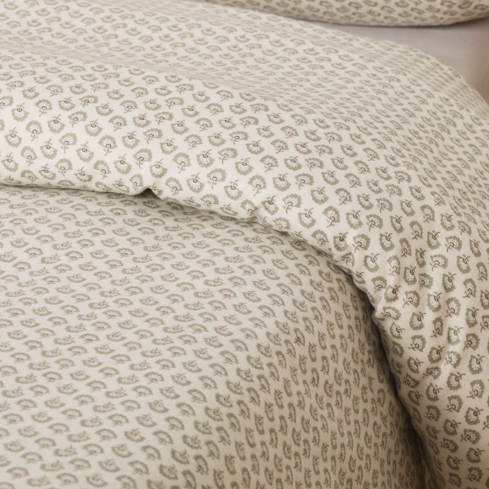 Funda nórdica y fundas de almohada con estampado de pequeñas flores verdes sobre un fondo blanco. Su tejido de franela es muy suave, ideales para el invierno por sus características térmicas.