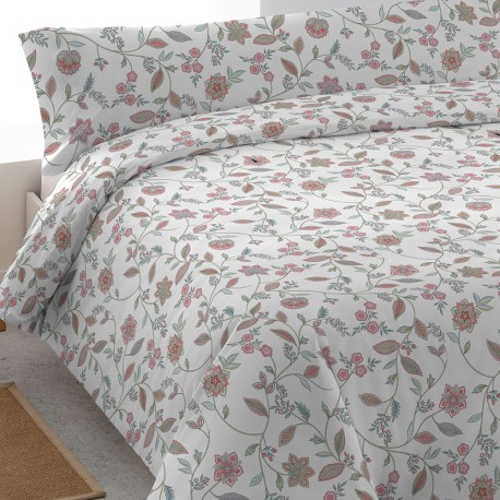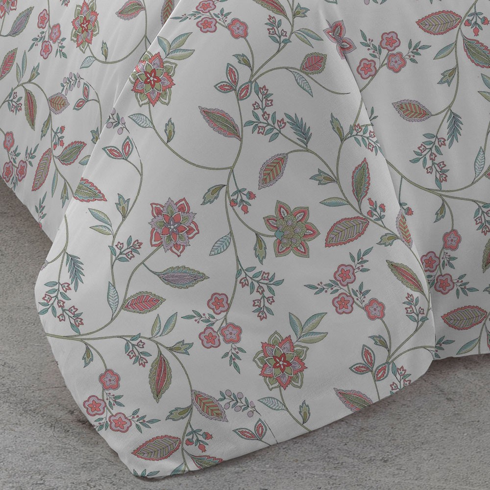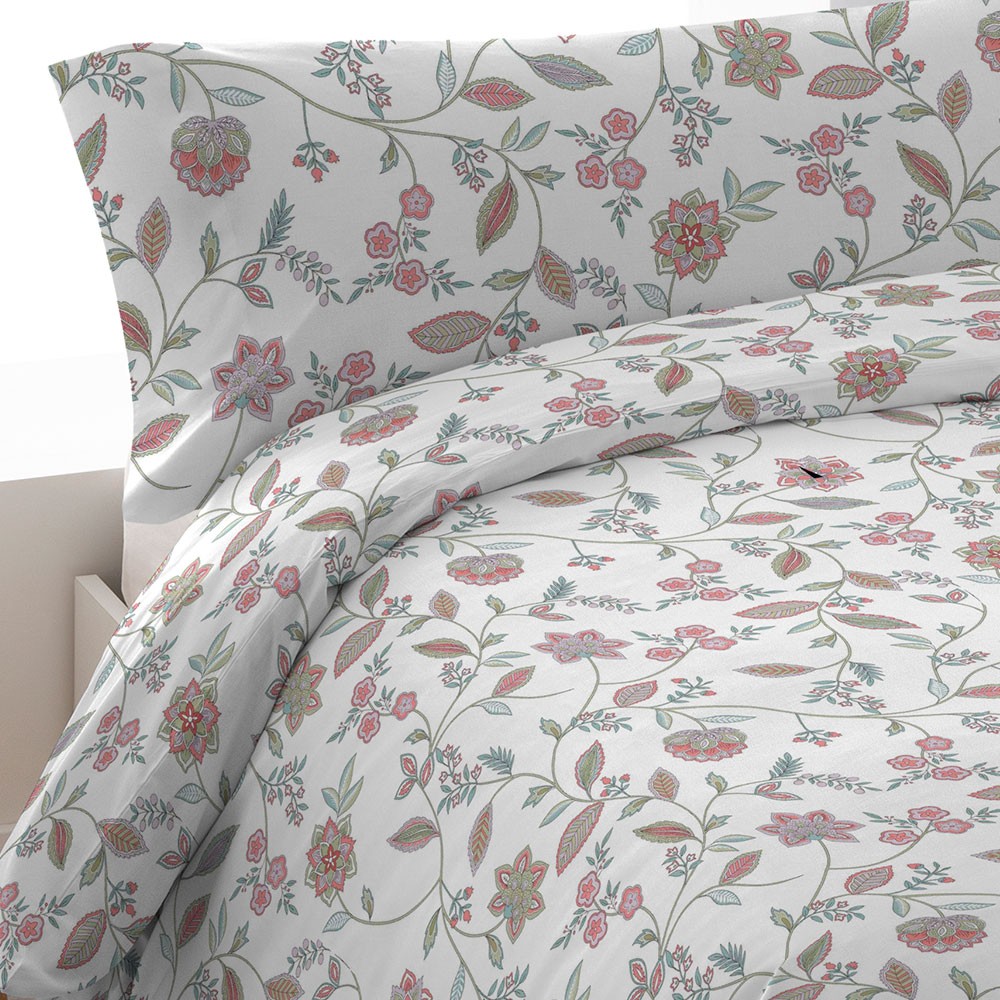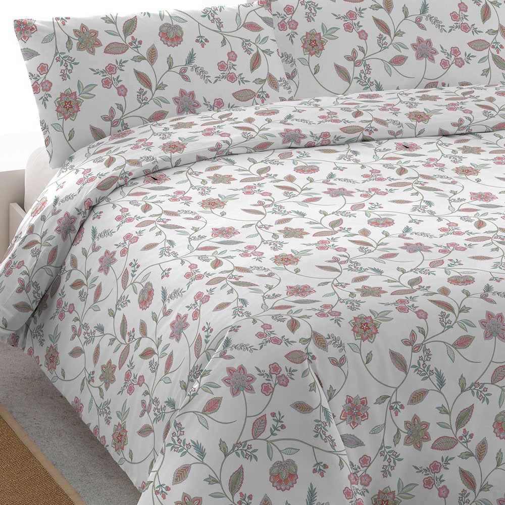 Funda nórdica 100% algodón percal de elevada resistencia a los lavados y excelente transpirabilidad con un estampado de flores y hojas en tonos rosas, malva y verde sobre un fondo blanco.