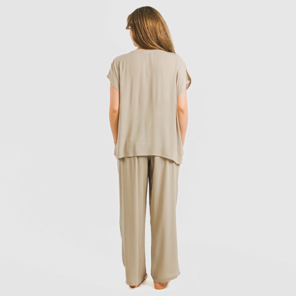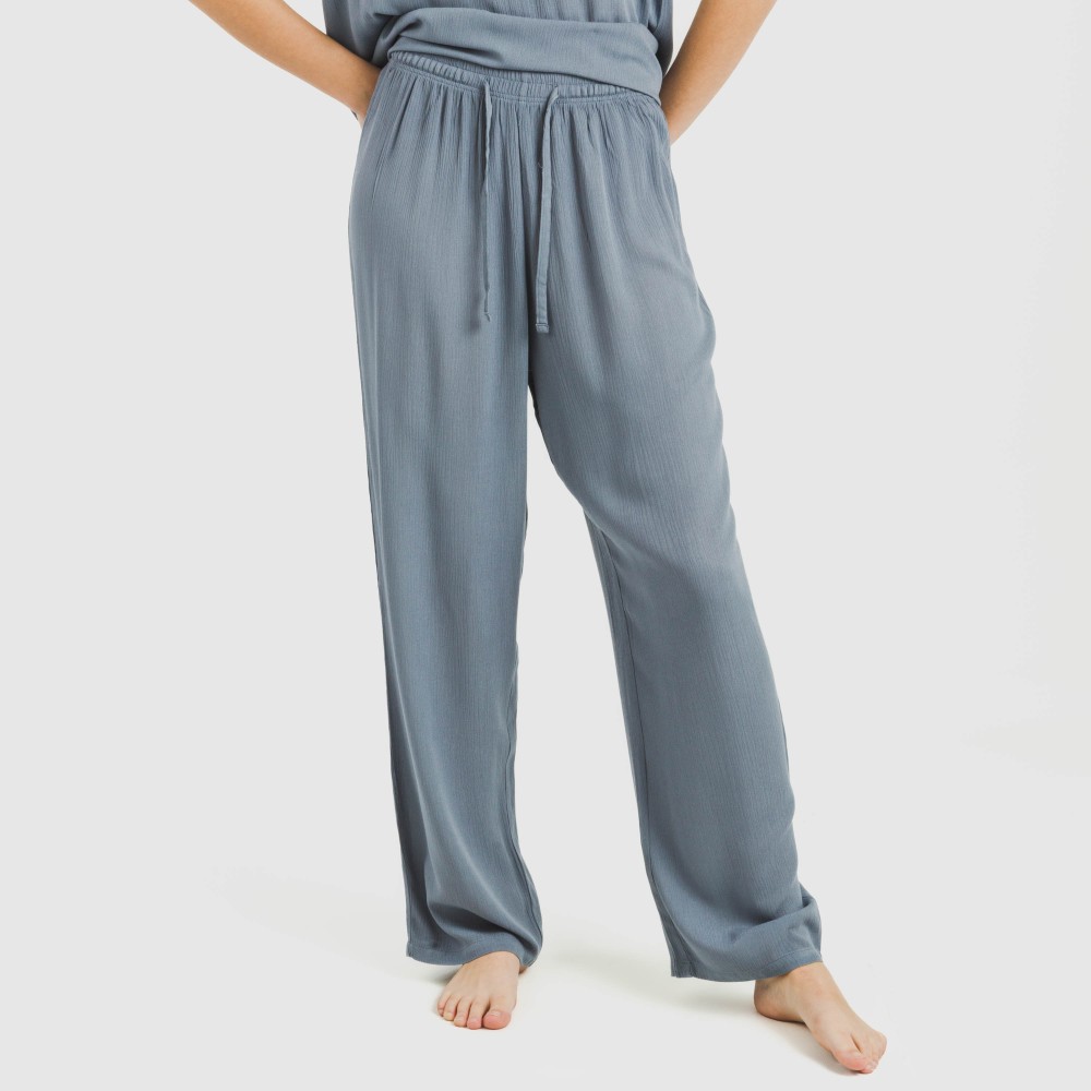 Pantalón largo holgado en color liso con cinturilla elástica y cordón ajustable.