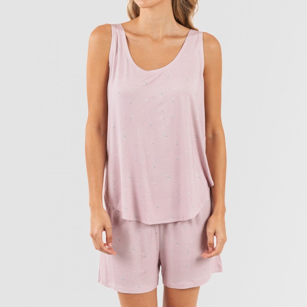 El pijama se conforma de una camiseta asimétrica de tirantes y un pantalón corto con cintura elástica de color malva con pequeñas flores blancas con toques azules.
