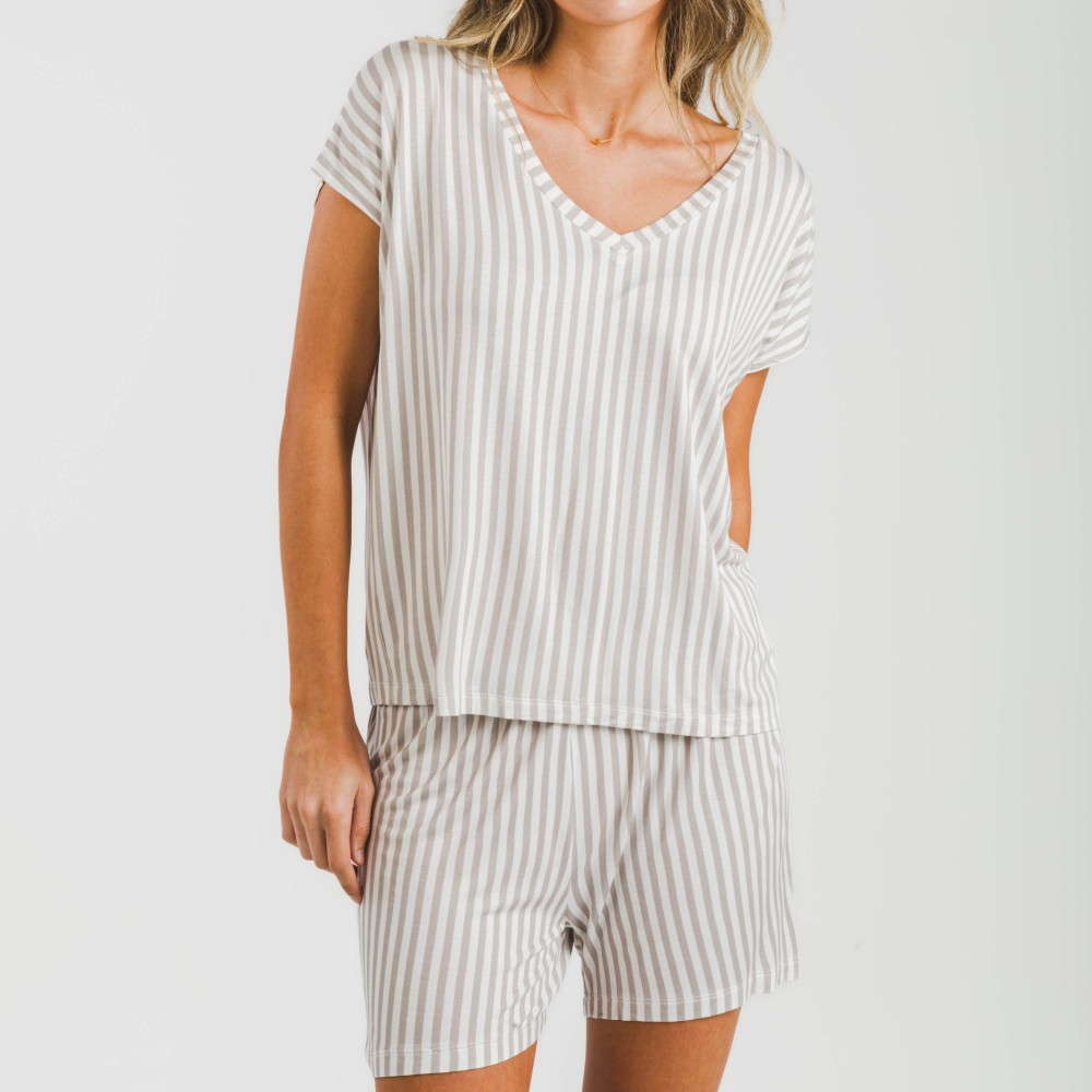El pijama se conforma de una camiseta en manga corta de color blanco con rayas grises y un pantalón del mismo diseño con la cintura elástica para que se ajuste al cuerpo.