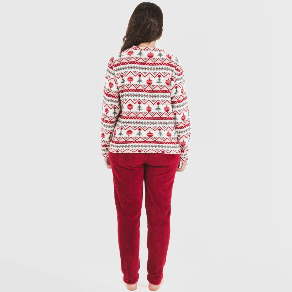 El pijama incluye una camiseta blanca con estampado navideño en tonos rojos y verdes y un pantalón liso rojo.