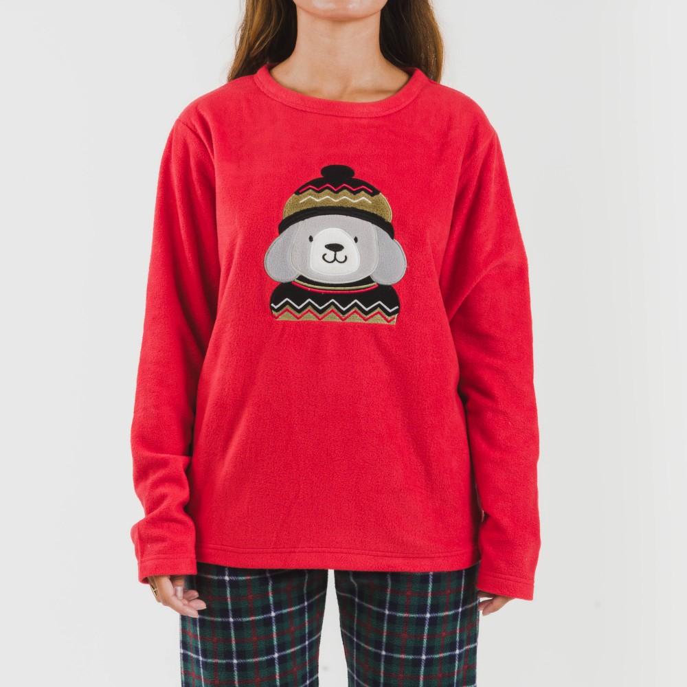 Pijama cómodo con camiseta de color rojo con estampado de un perrito en la parte central y un pantalón de cuadros en tonos verdes, azules y rojos.
