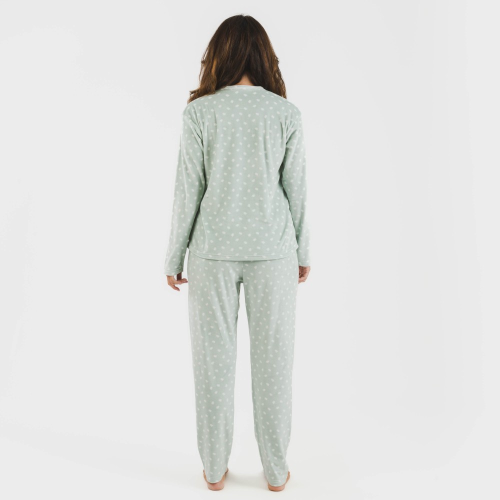 El pijama incluye una camiseta y un pantalón de color verde con estampado de pequeñas hojas blancas.