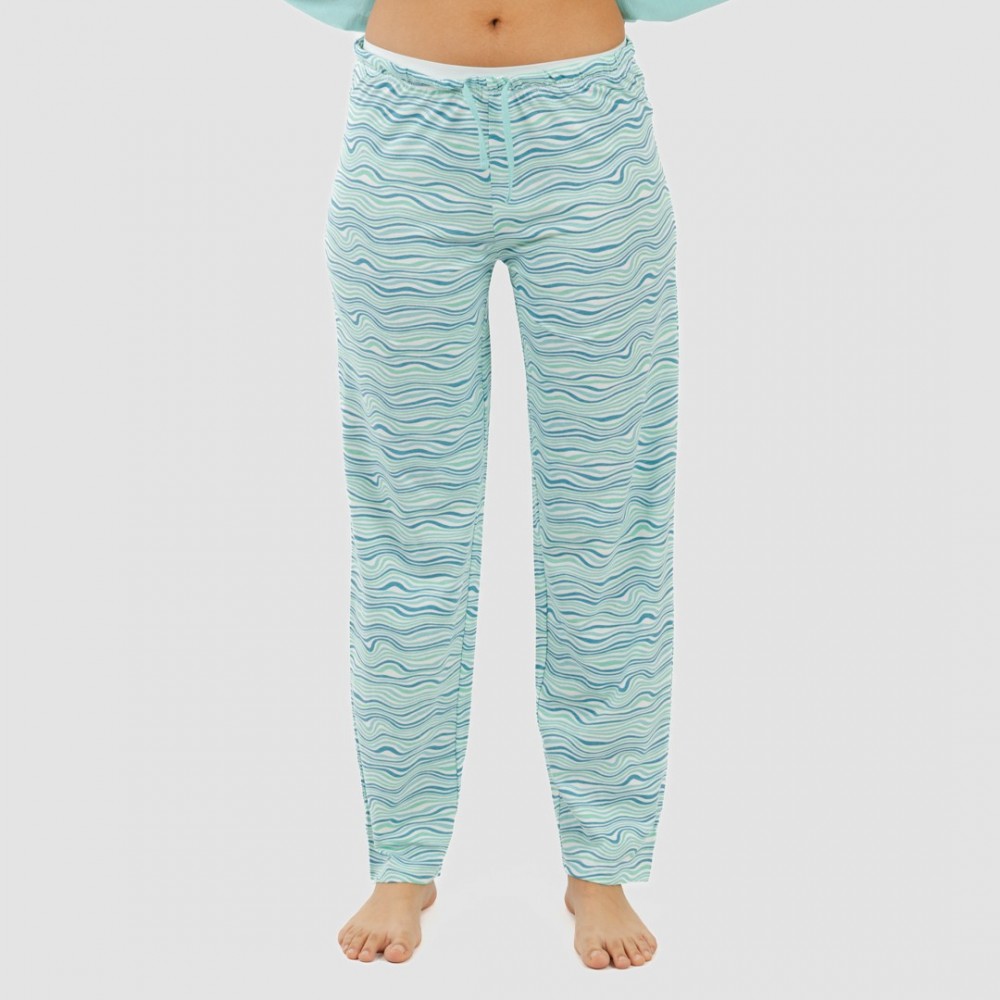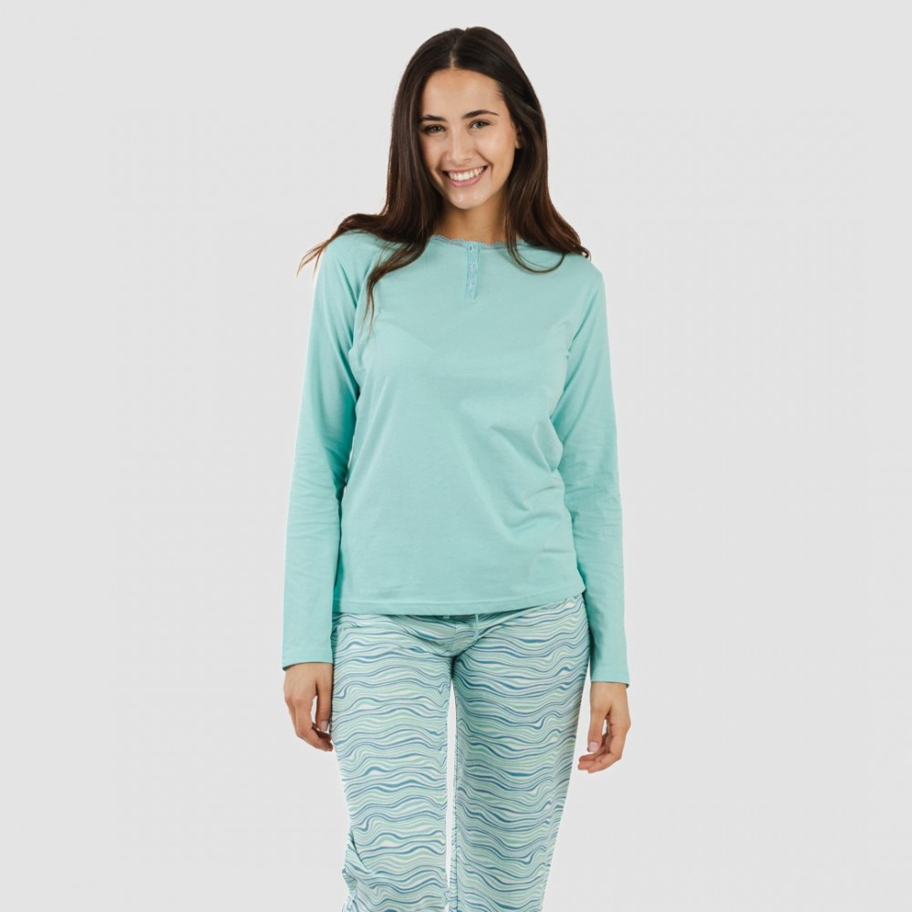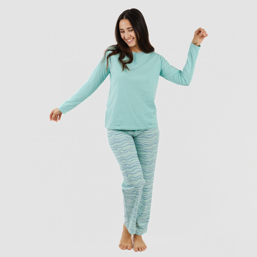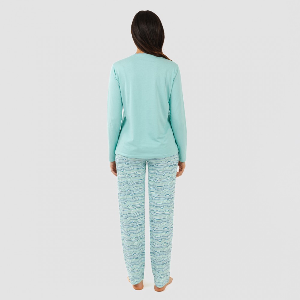 El pijama se conforma de una camiseta lisa de manga larga en color verde agua con tres botones pequeños en la parte del cuello y un pantalón estampado de rayas onduladas formando olas en diferentes tonos de azul sobre un fondo blanco. El pantalón del pijama tiene la cintura elástica recubierta con una cinta para ajustar.