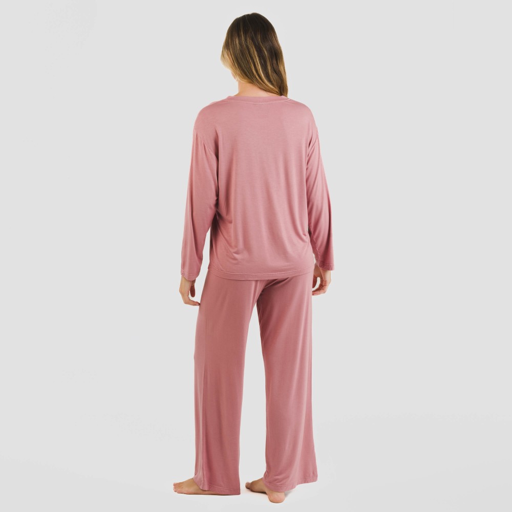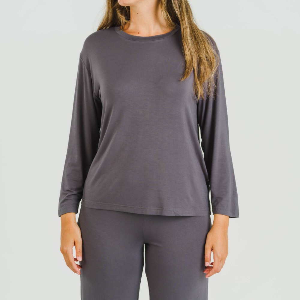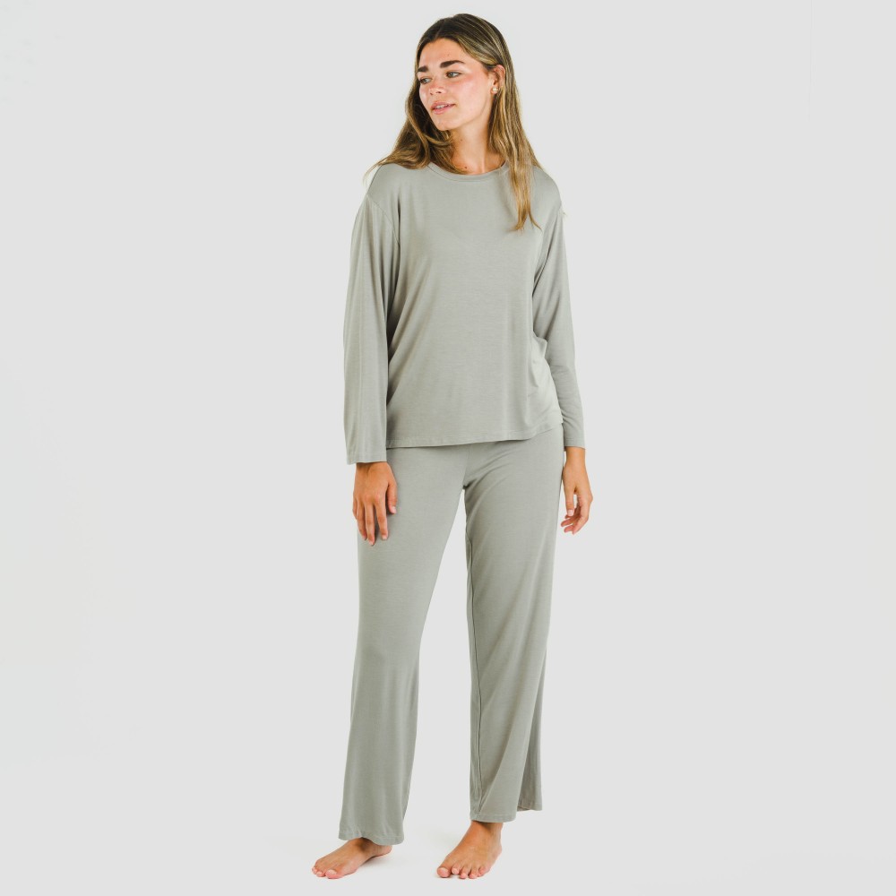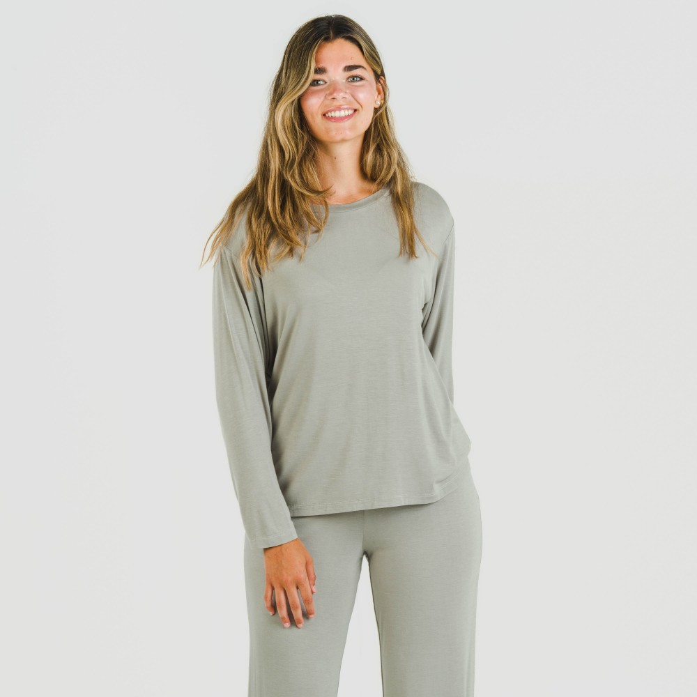 Este pijama incluye una camiseta lisa de manga larga con cuello redondo y un pantalón largo y ancho del mismo tono con cintura elástica para que se pueda ajustar mejor al cuerpo