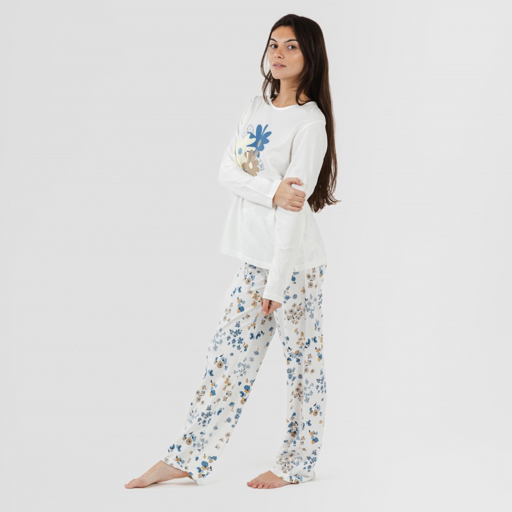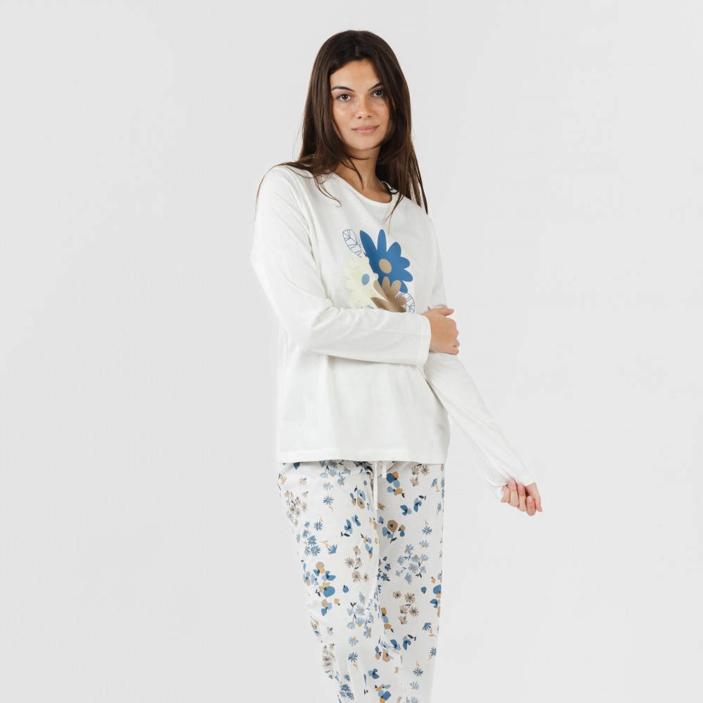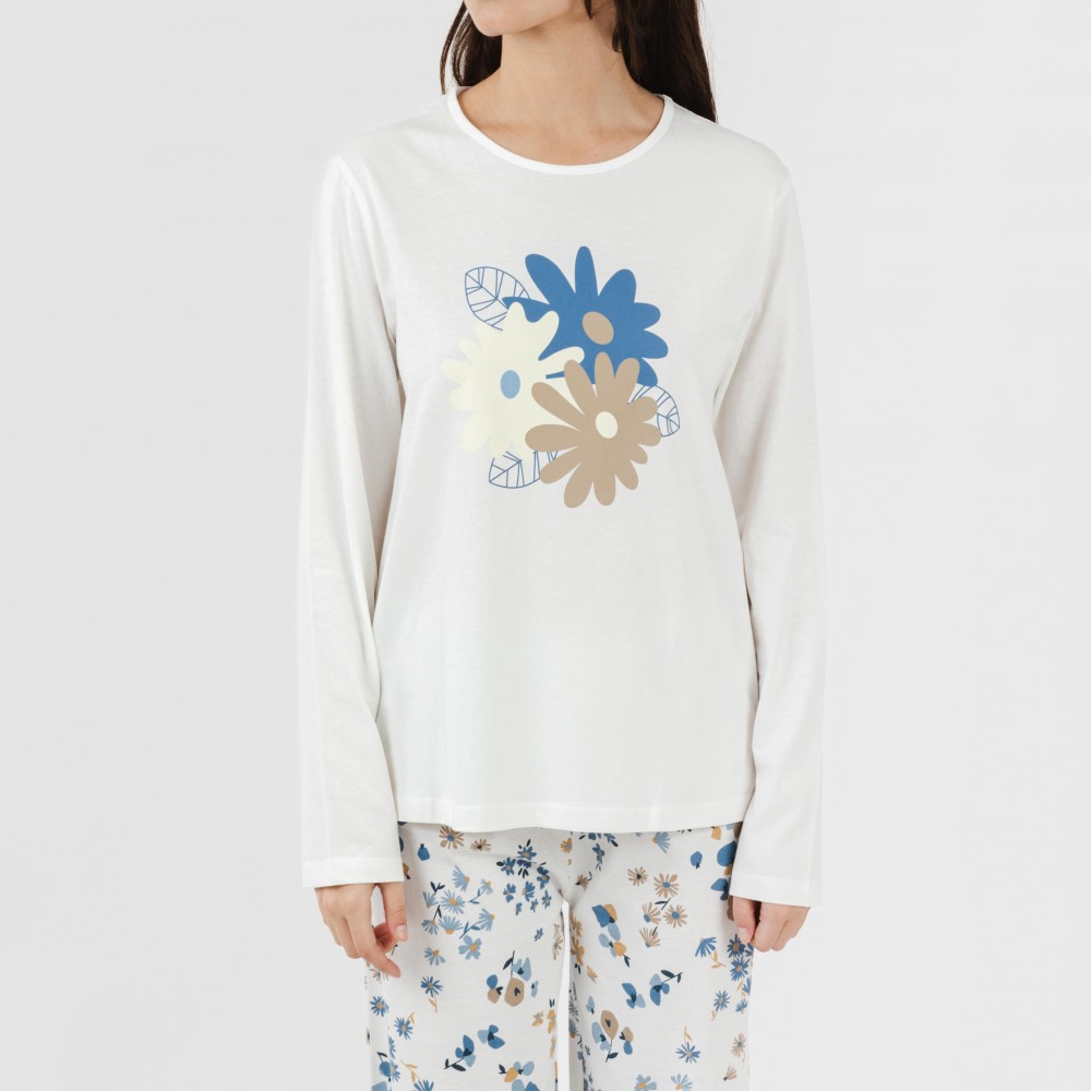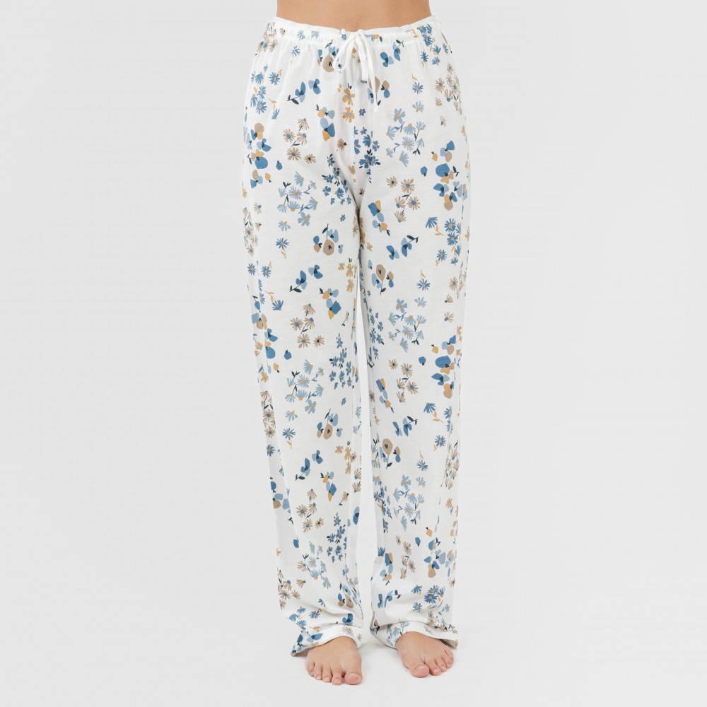 El pijama se conforma de una camiseta lisa de color blanco con flores azules y beiges en la parte central y un pantalón con estampado de flores en los mismos colores sobre fondo blanco. El pantalón del pijama tiene la cintura elástica recubierta con una cinta para ajustar.