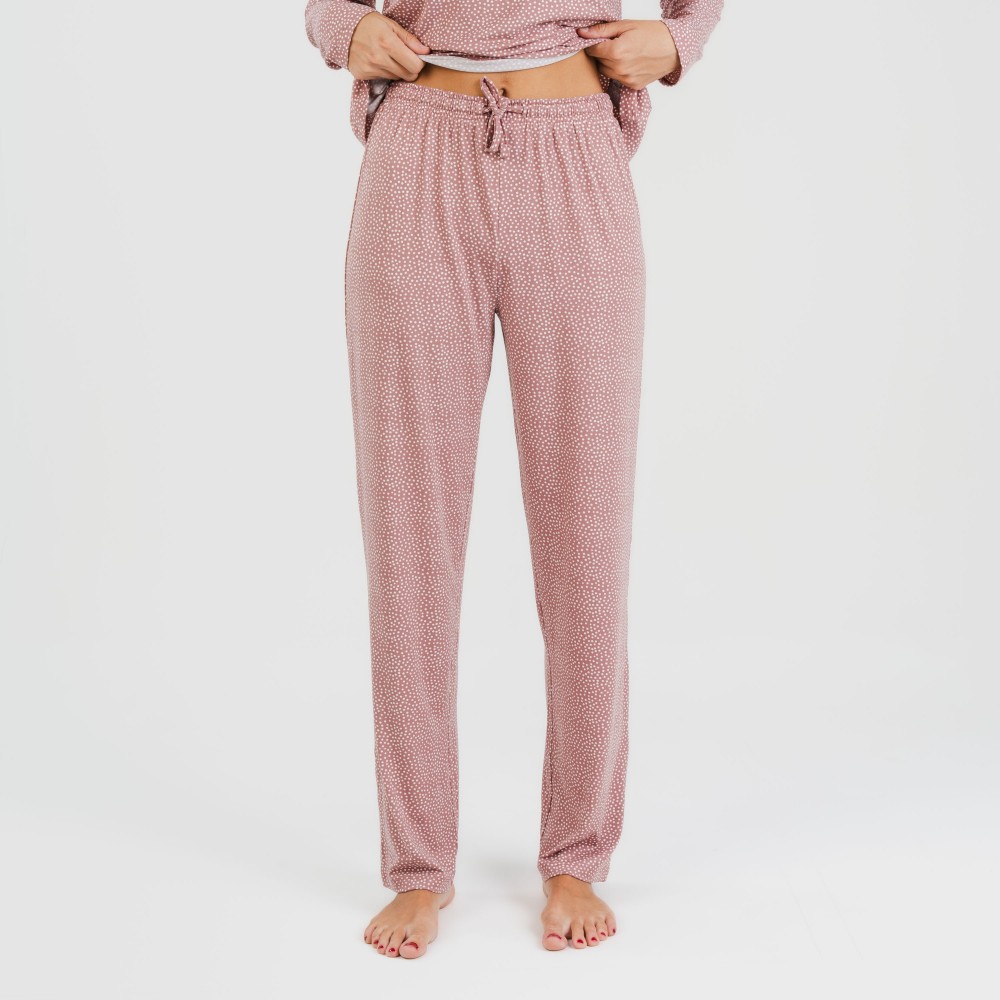 El pijama se conforma de una camiseta y un pantalón de color malva con estampado de pequeñas puntitos blancos. El pantalón del pijama tiene la cintura elástica para que se ajuste mejor al cuerpo.