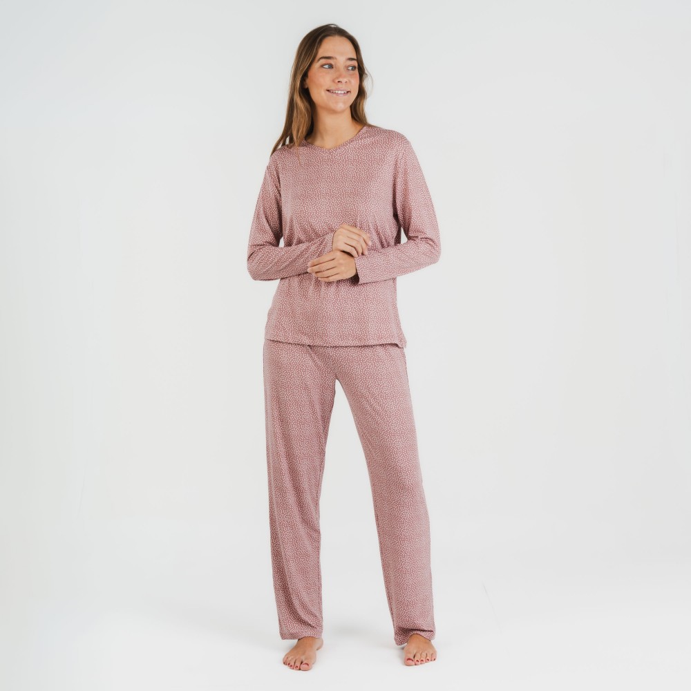 Pijama de mujer modelo Lolenda malva rosa compuesto por camiseta de manga larga y pantalón largo de tacto suave.