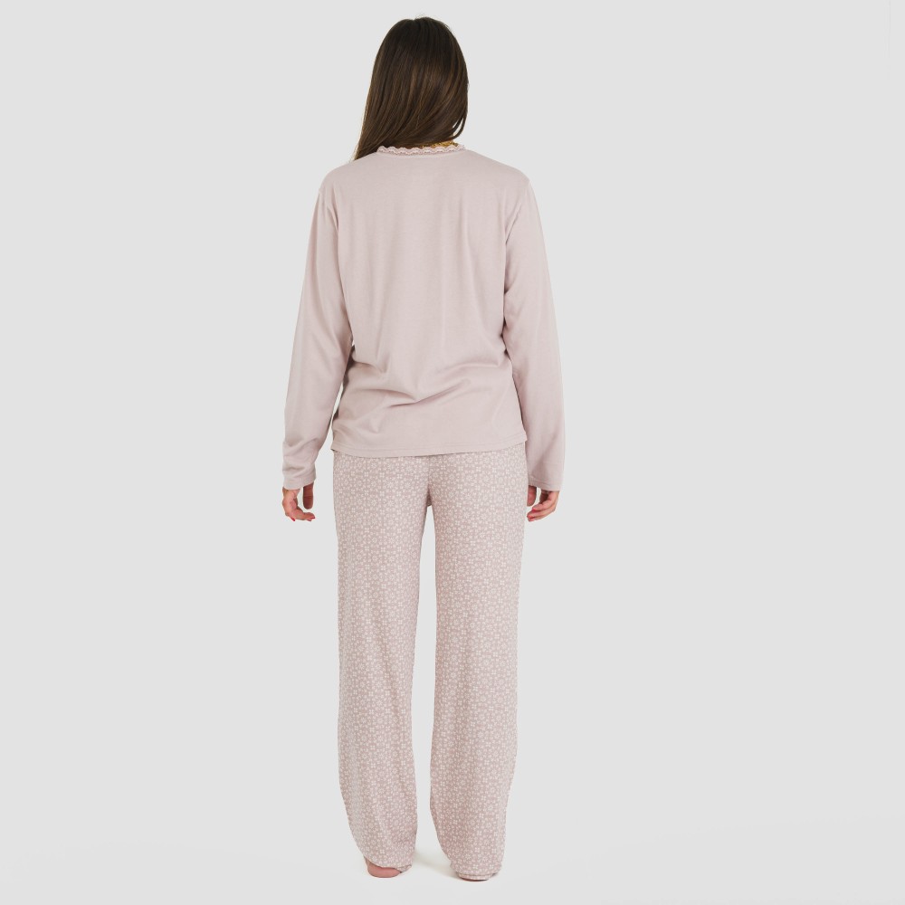 El pijama se conforma de una camiseta lisa de manga larga en color rosa con tres botones pequeños en la parte del cuello y un pantalón con estampado de pequeñas flores blancas sobre un fondo rosa. El pantalón del pijama tiene la cintura elástica recubierta con una cinta para poder ajustarlo.
