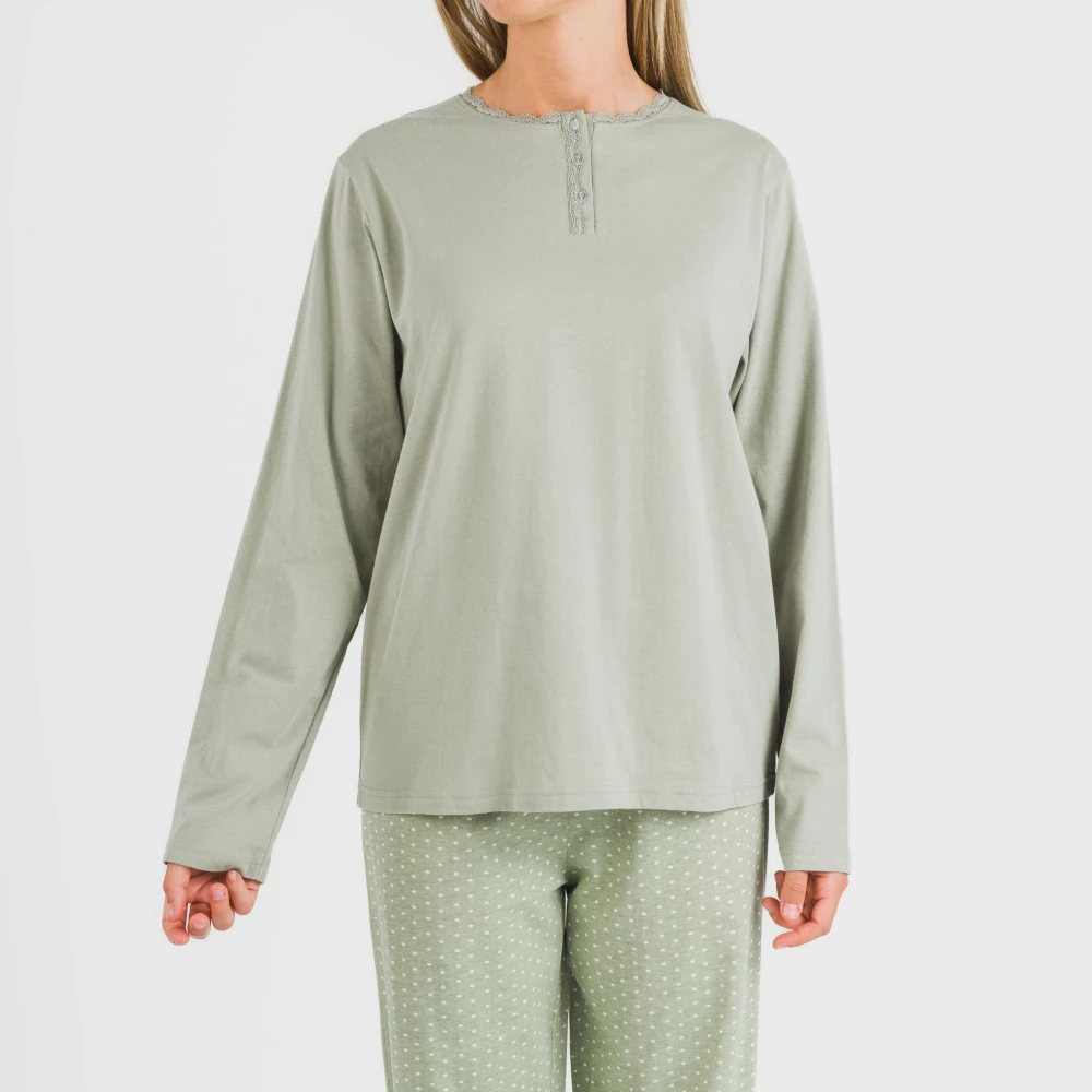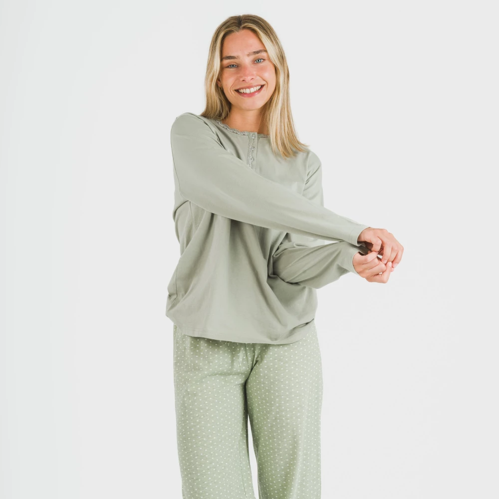 El pijama se conforma de una camiseta lisa de manga larga en color verde con tres botones pequeños en la parte del cuello y un pantalón con estampado de lunares blancos sobre un fondo verde cacería. El pantalón del pijama tiene la cintura elástica recubierta con una cinta para ajustar.