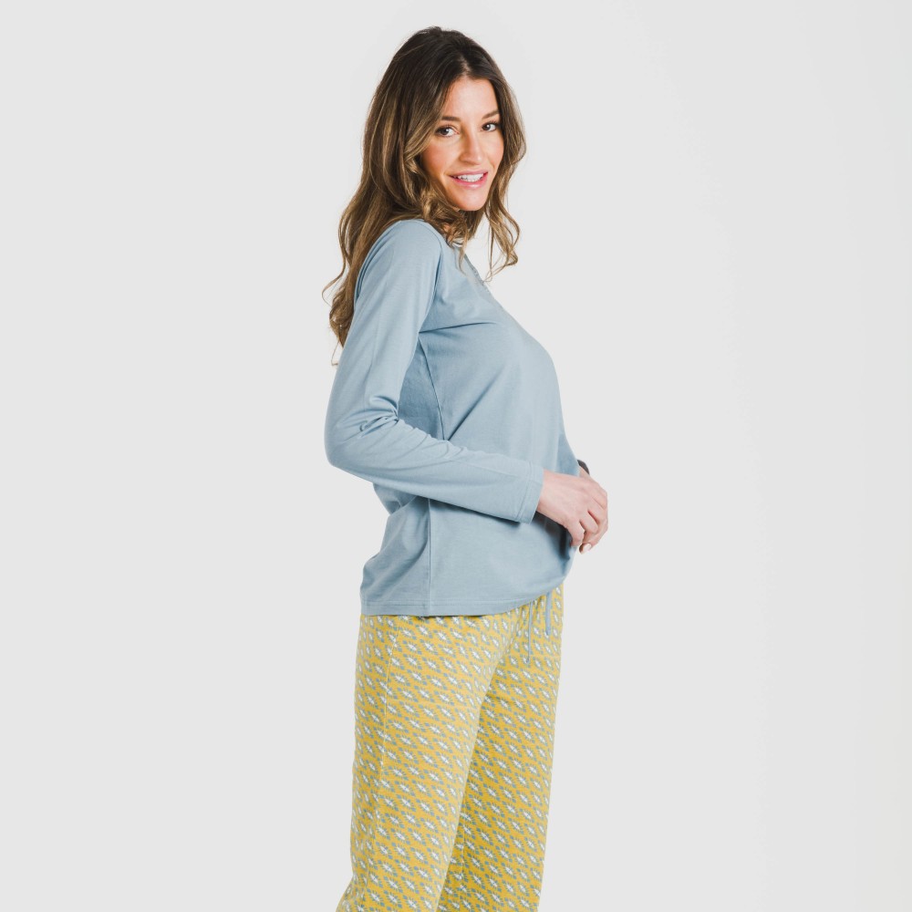 El pijama se conforma de una camiseta lisa de manga larga en color azul con tres botones pequeños en la parte del cuello y un pantalón mostaza con estampado en tonos blancos y azules.