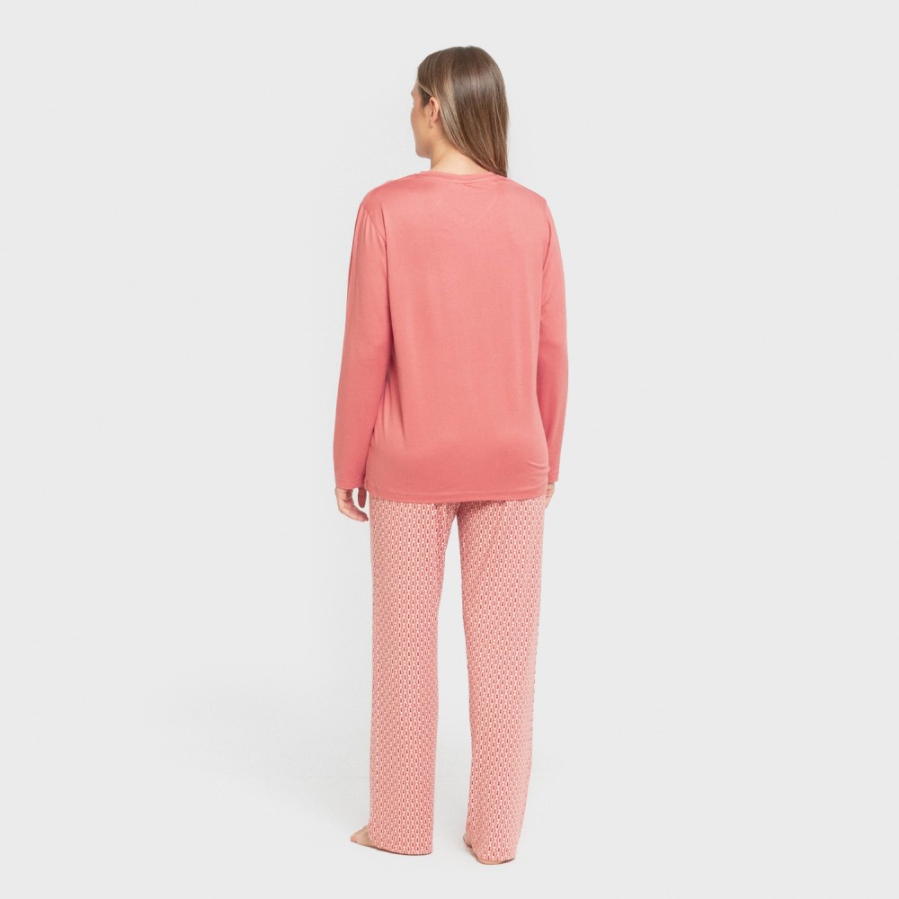 El pijama se conforma de una camiseta lisa con cuello de pico en color malva y un pantalón con estampado geométrico de color blanco y marsala sobre un fondo rosa