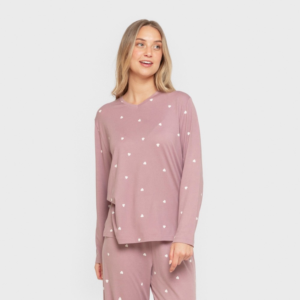 El pijama se conforma de una camiseta y un pantalón en color berenjena con estampado de corazones blancos. El pantalón del pijama tiene la cintura elástica y un cordón para que se ajuste mejor al cuerpo.