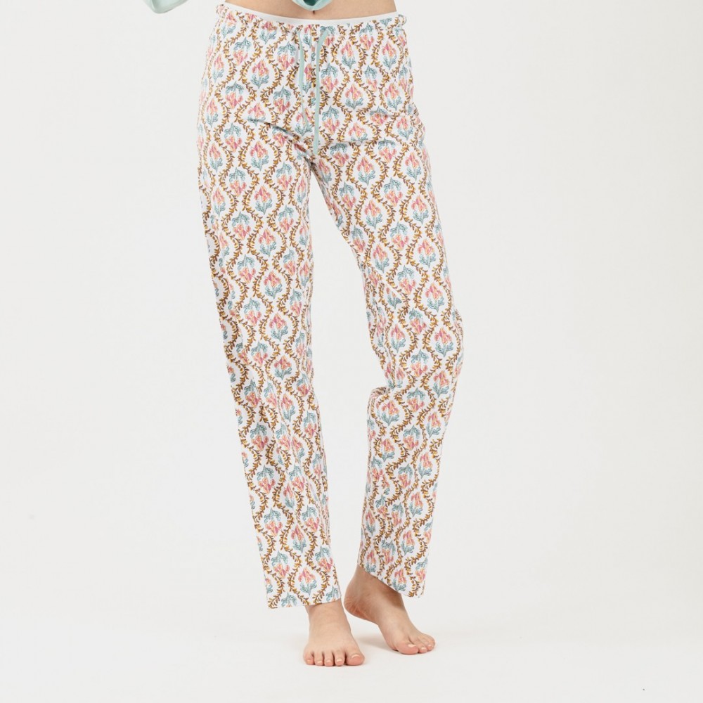 El pijama se conforma de una camiseta lisa en color verde tiffany con tres botones pequeños en la parte del cuello y un pantalón con estampado original de flores y hojas en tonos verdes y rosas sobre un fondo blanco.