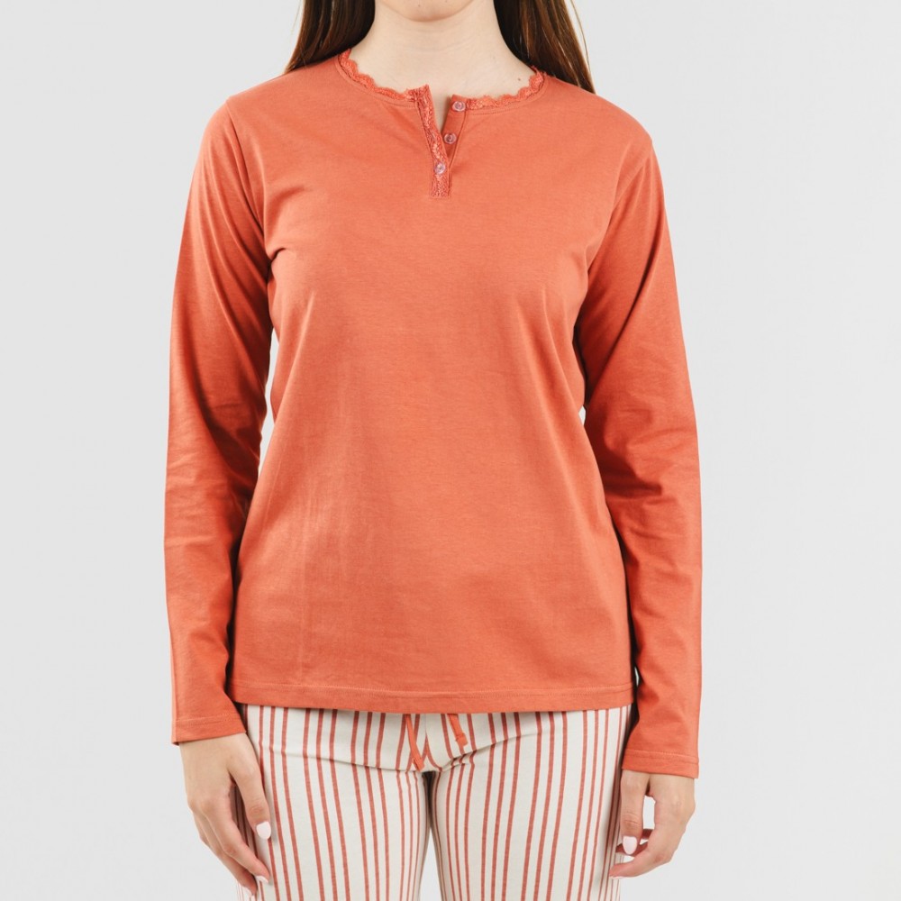 El pijama se conforma de una camiseta lisa en color teja con tres botones en la parte del cuello y un pantalón con estampado sencillo de rayas en color rojo teja sobre un fondo blanco.