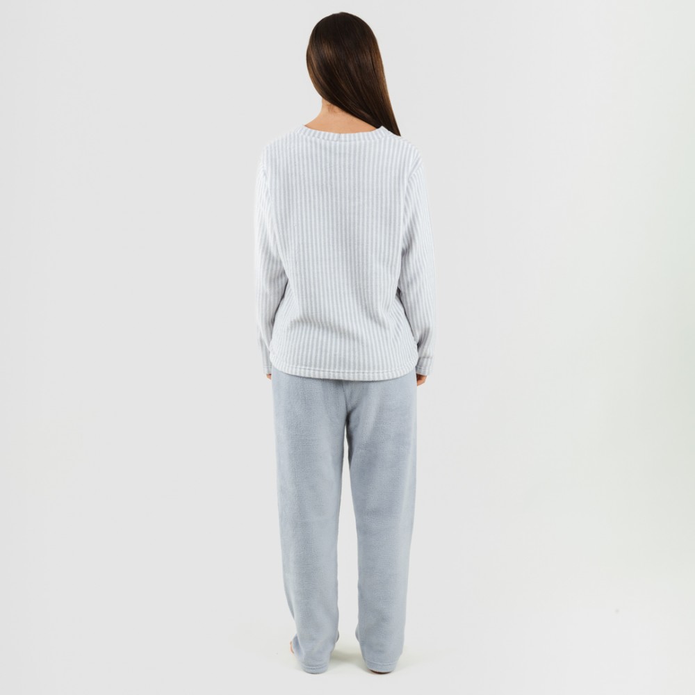 El pijama incluye una camiseta de rayas grises y blancas y un pantalón gris liso. Aquí tiene lo que buscaba para estar en casa, cómoda y relajada para ir a dormir, con un diseño y un estilo divertido, atractivo y confortable.