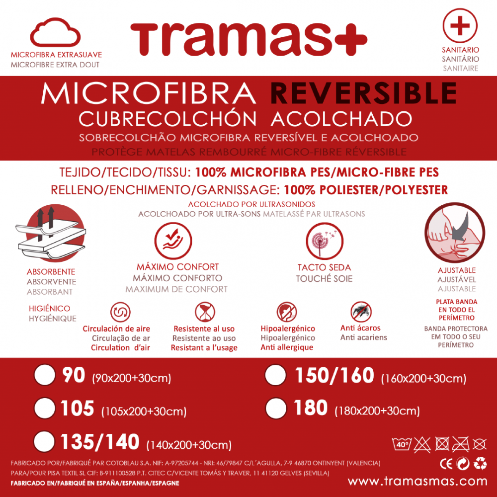 El Cubrecolchón microfibra reversible cuenta con platabanda en todo su perímetro para ofrecer el máximo confort y una gran suavidad por su tacto de seda, es transpirable y facilita la circulación reduciendo la humedad.