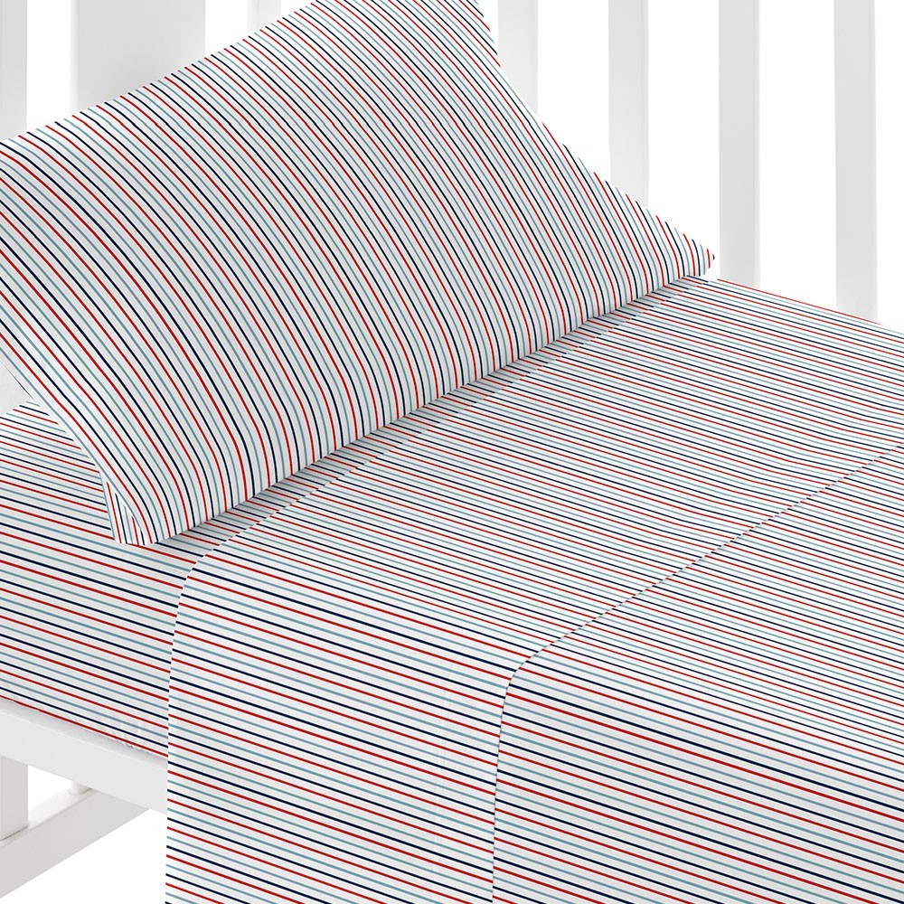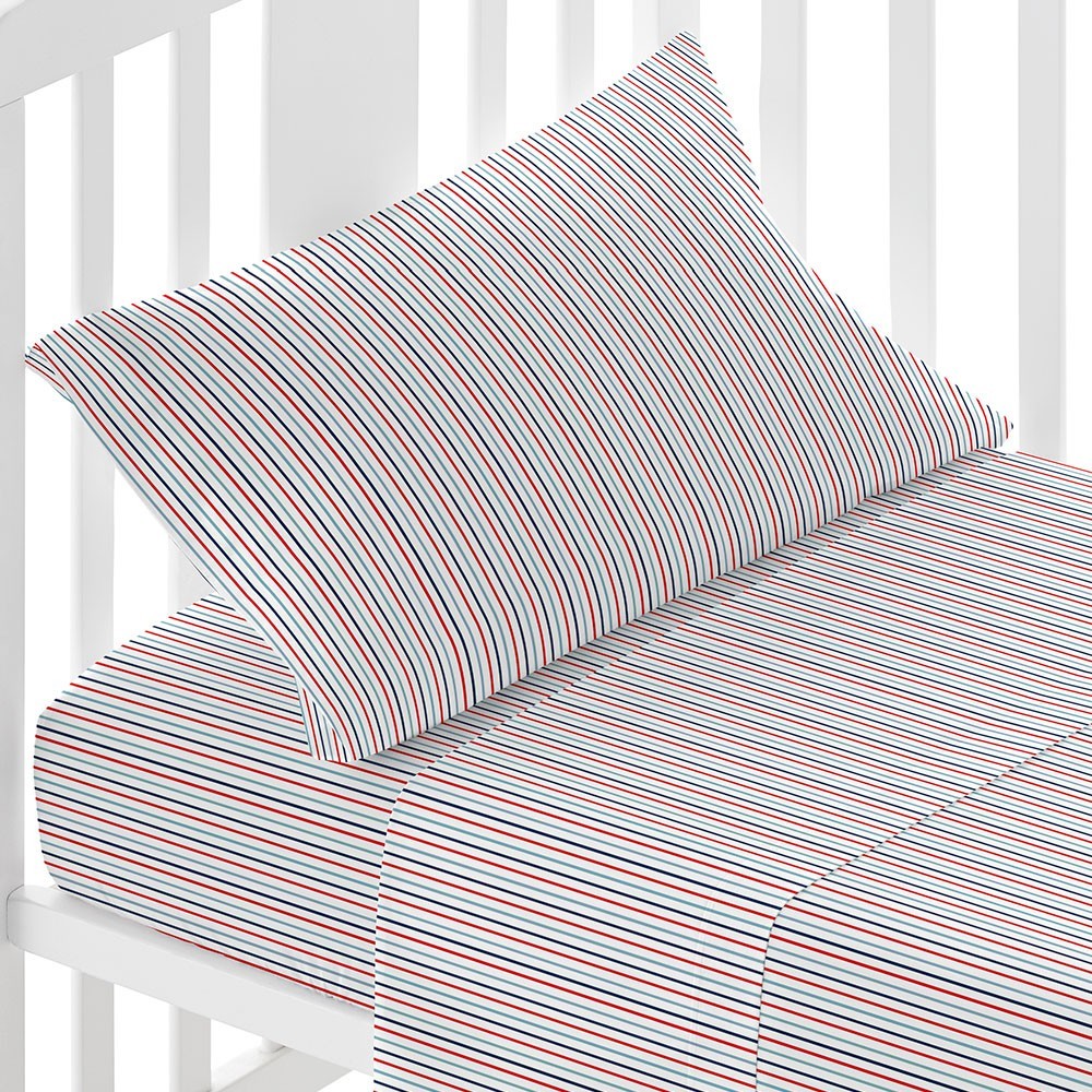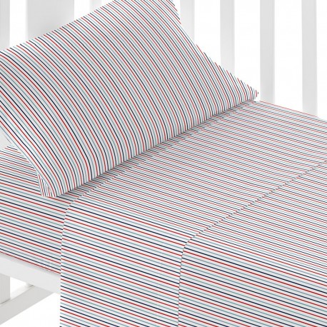 Sábanas y funda de almohada con un diseño clásico de finas rayas en tonos azules y rojo sobre un fondo blanco. ¡Dale color a tu nueva habitación con un diseño original y fácilmente combinable!