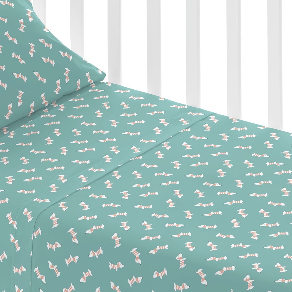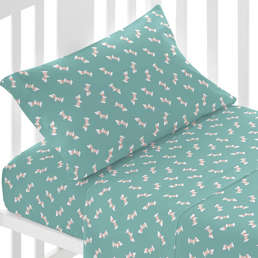 Sábanas y funda de almohada con estampado juvenil de pequeños perritos en tonos blanco y arena sobre un fondo verde azulado. ¡Dale color a tu nueva habitación con un diseño original y fácilmente combinable!