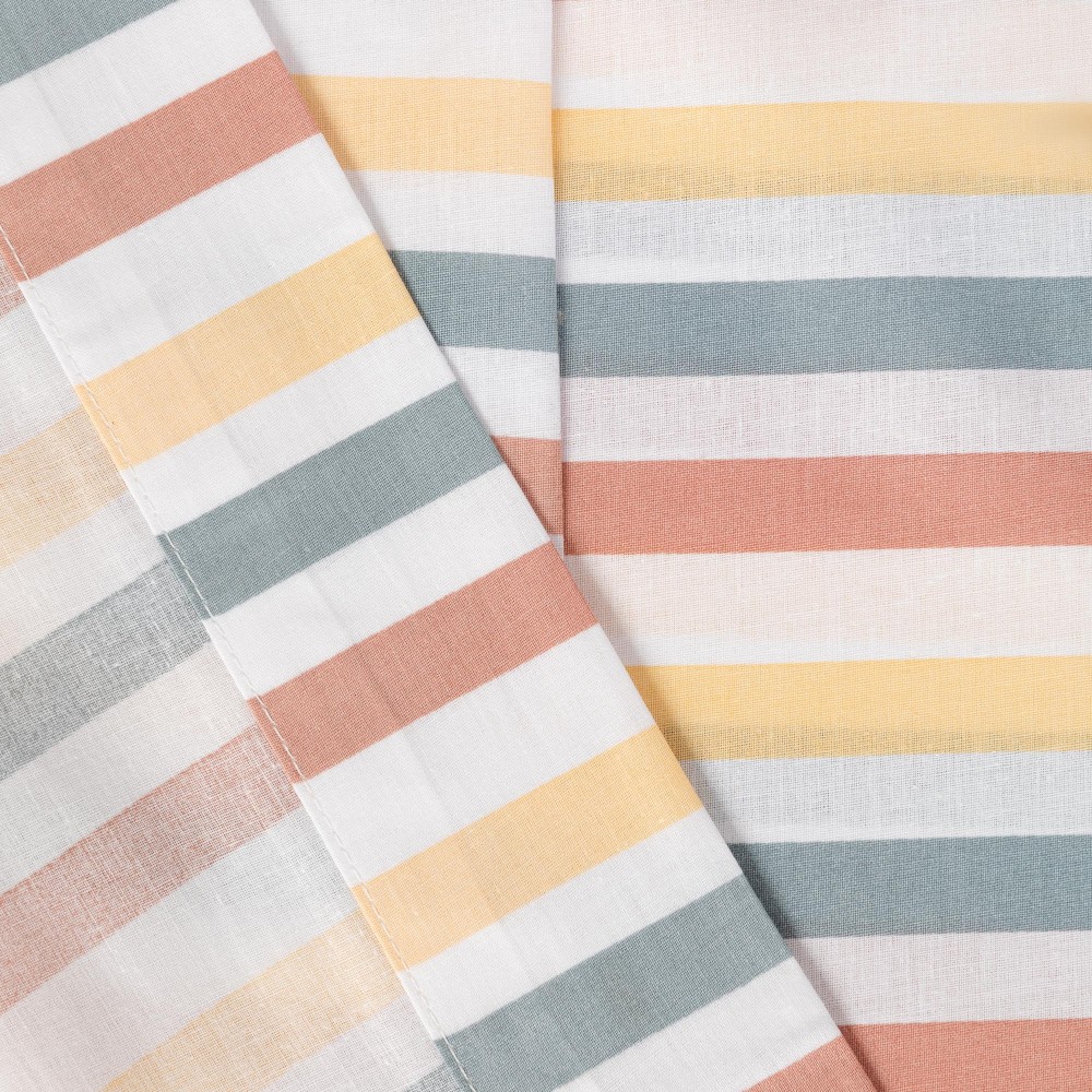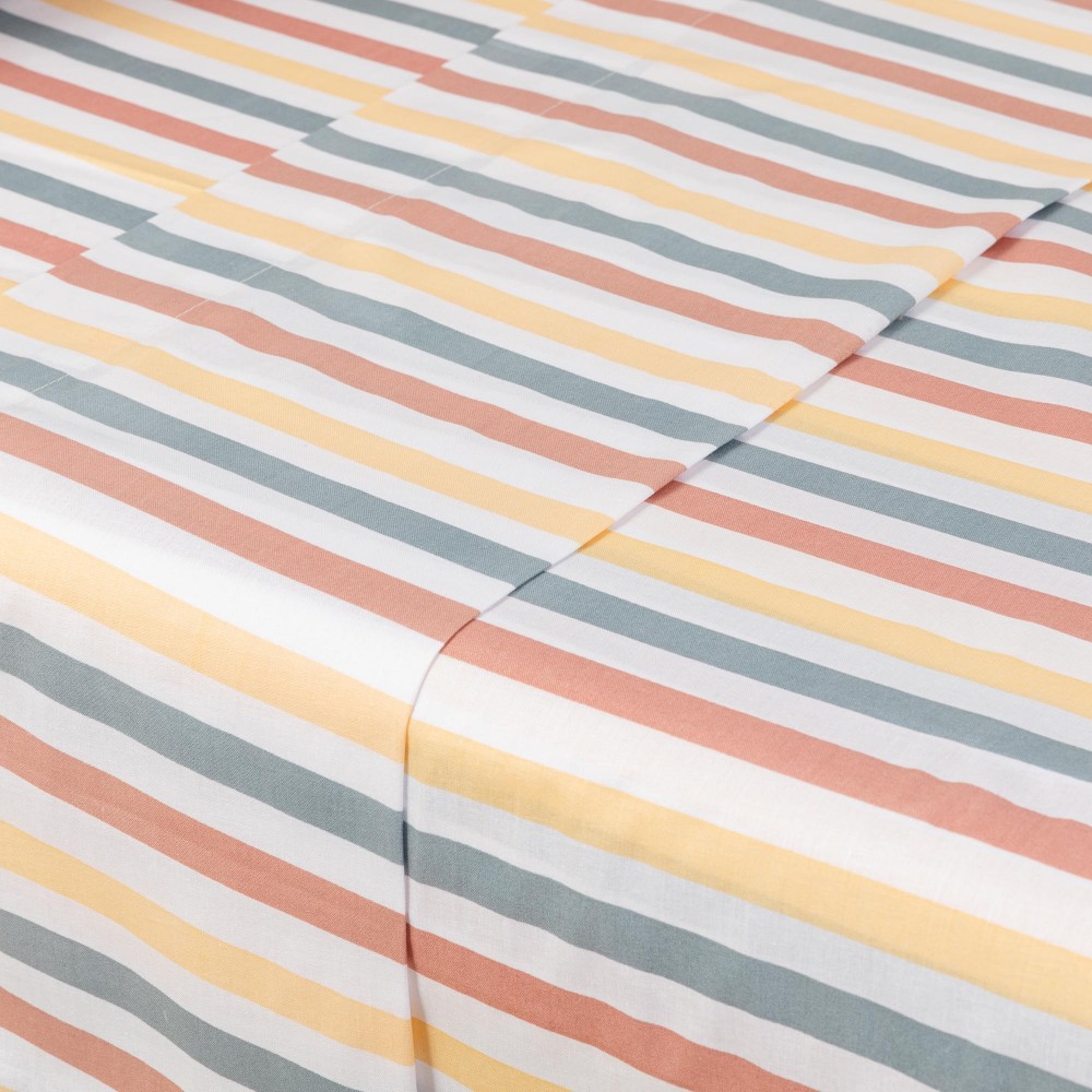 Sábanas y funda de almohada de rayas en tonos verde, naranja y amarillo sobre un fondo blanco.