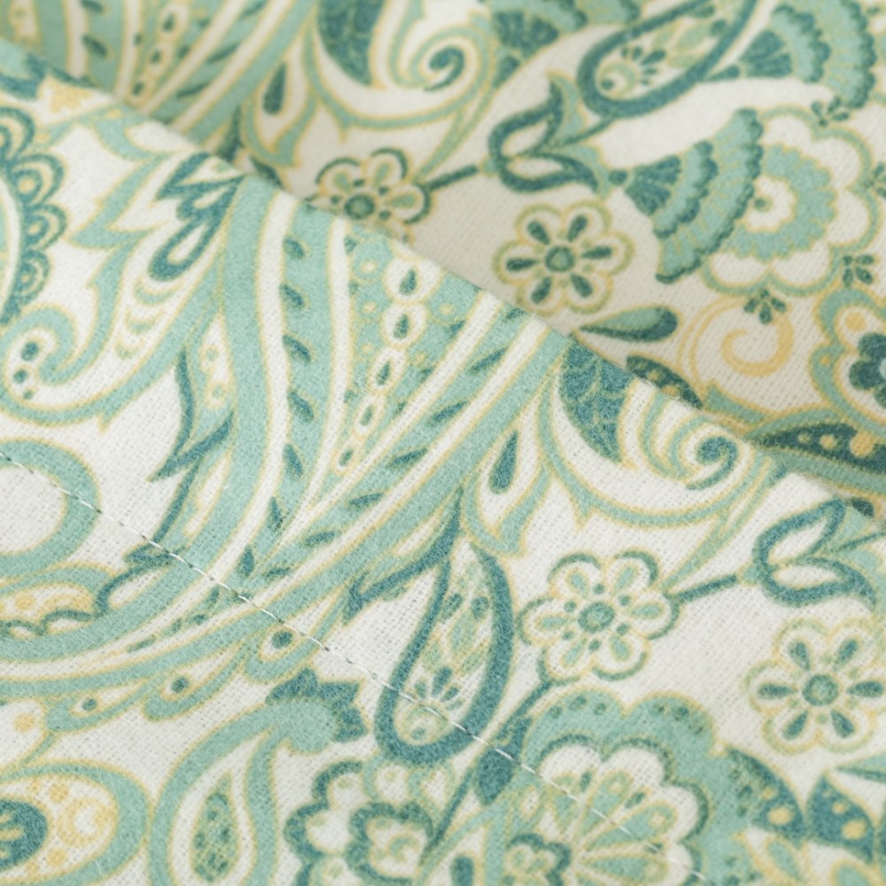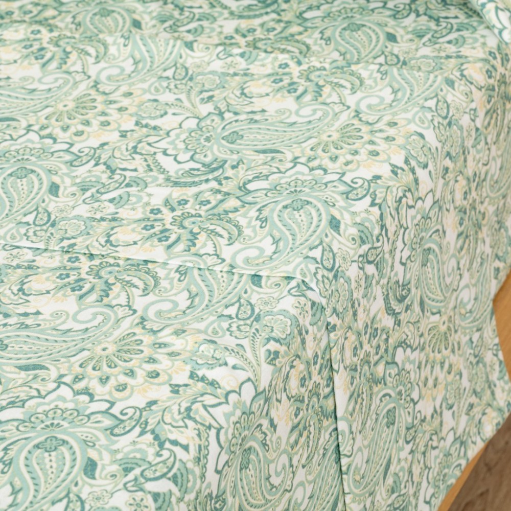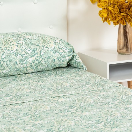 Sábanas y funda de almohada con estampado discreto y elegante de cachemir en tonos verdes y arena sobre un fondo blanco en tejido de franela muy suave, ideales para el invierno por sus características térmicas.