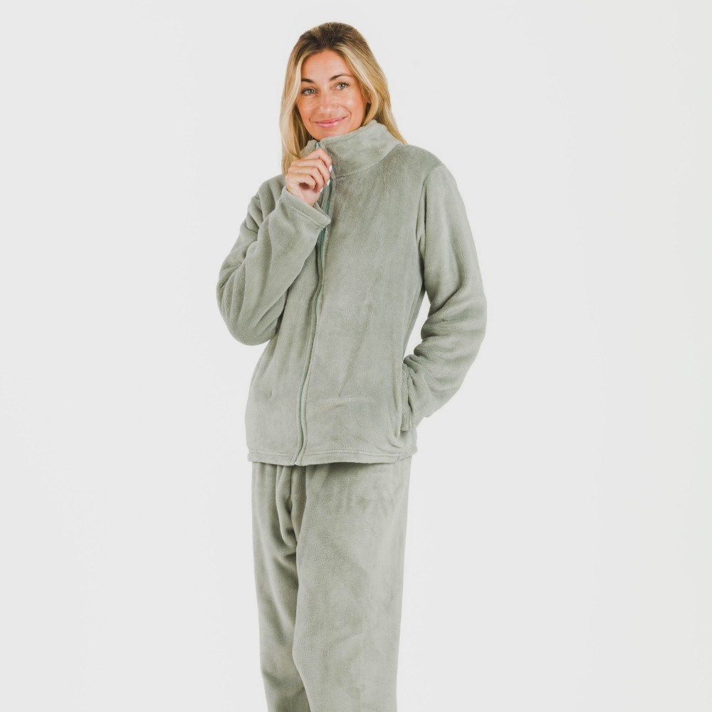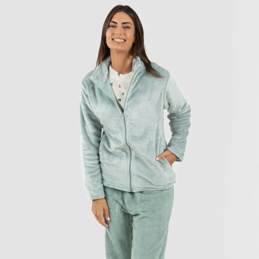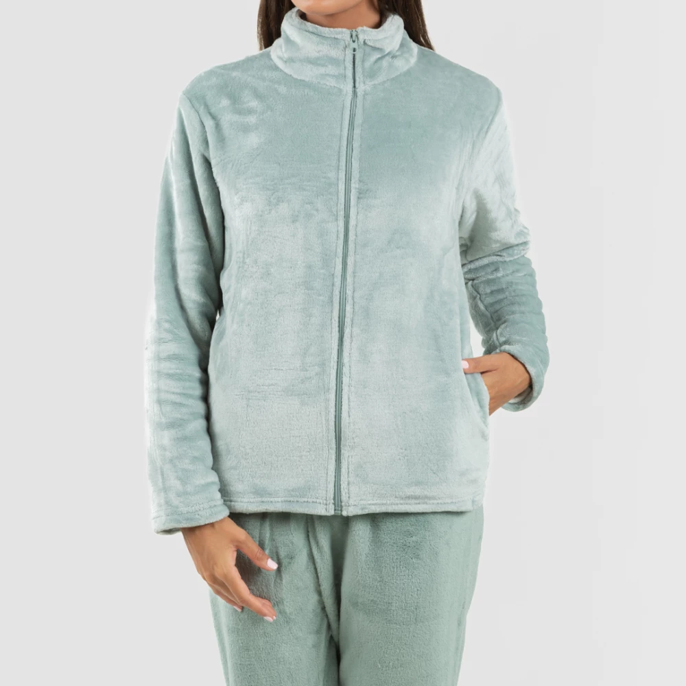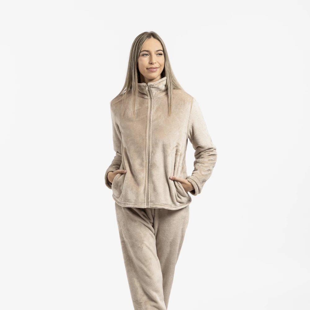 Una prenda perfecta para el invierno, cálida y super suave para sentirse cómoda tanto en el hogar como fuera de casa, cuenta con dos bolsillos laterales, cuello alto y una cremallera para que sea más sencillo llevarla.