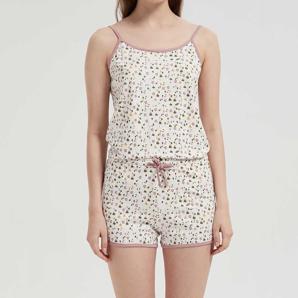 Mono corto confeccionado en 100% algodón, con tirantes regulables.