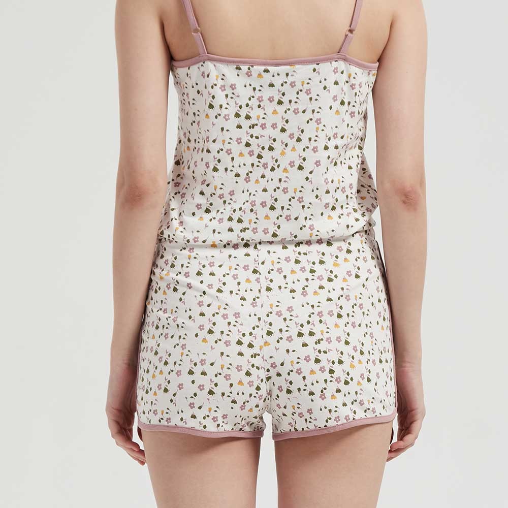 Mono estampado de pequeñas flores rosas, verdes y amarillas sobre un fondo blanco con bordes y tirantes en un tono rosa dando un toque más original, además tiene una pequeña lista rosa en el lateral del pantalón destacable al tacto que resalta en el estampado aportando color.