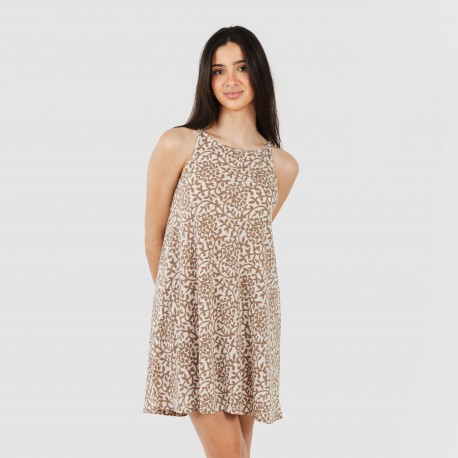 Su diseño presenta un estampado con enredaderas de hojas de color arena sobre un fondo blanco, la espalda tiene una pequeña abertura unida por una fina tira que lo hace el vestido perfecto para estar cómoda y sin pasar calor en los días de verano.