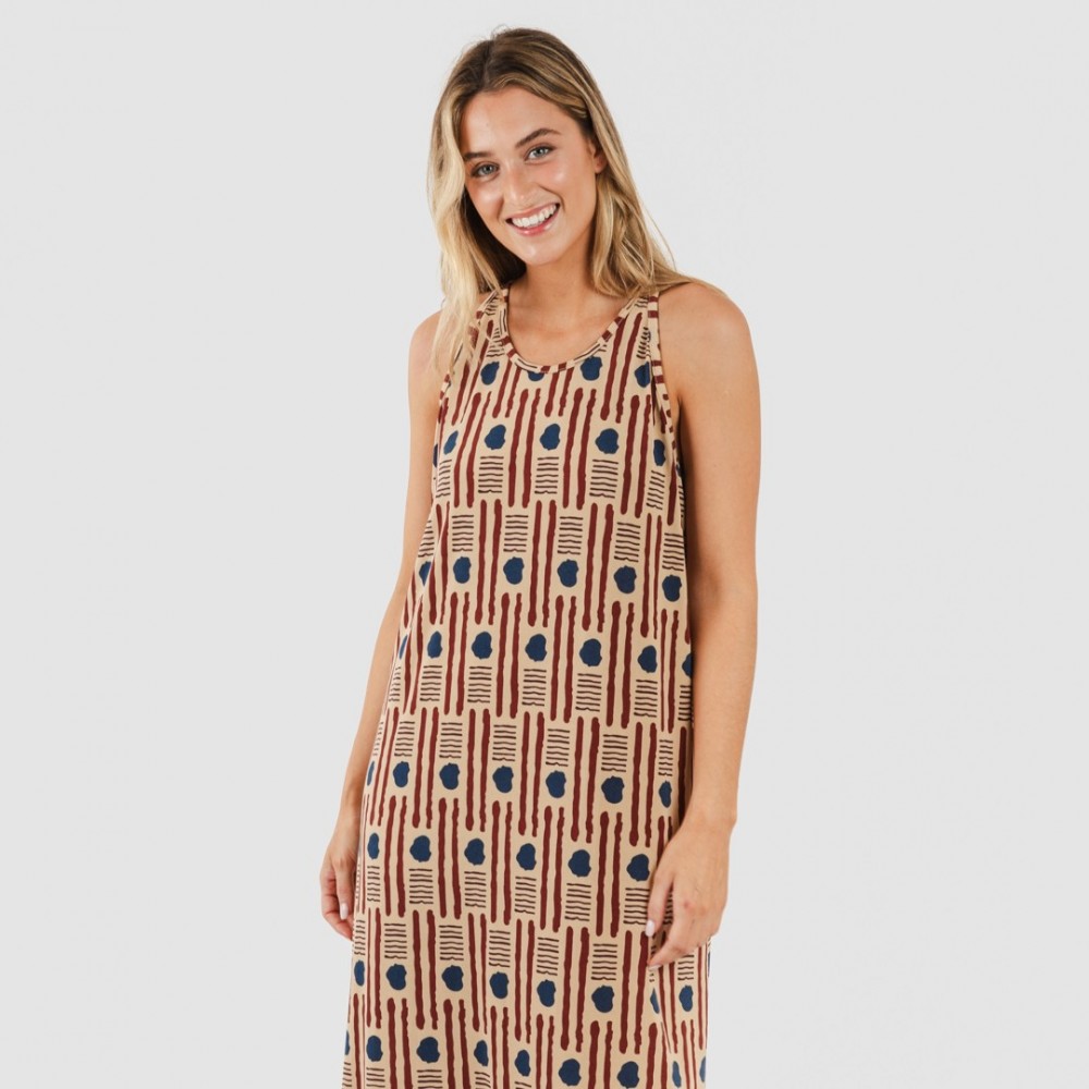 Vestido largo con tirantes y escote redondo. Su diseño presenta un estampado de diferentes rayas y círculos en tonos marrones y verdes sobre un fondo arena.