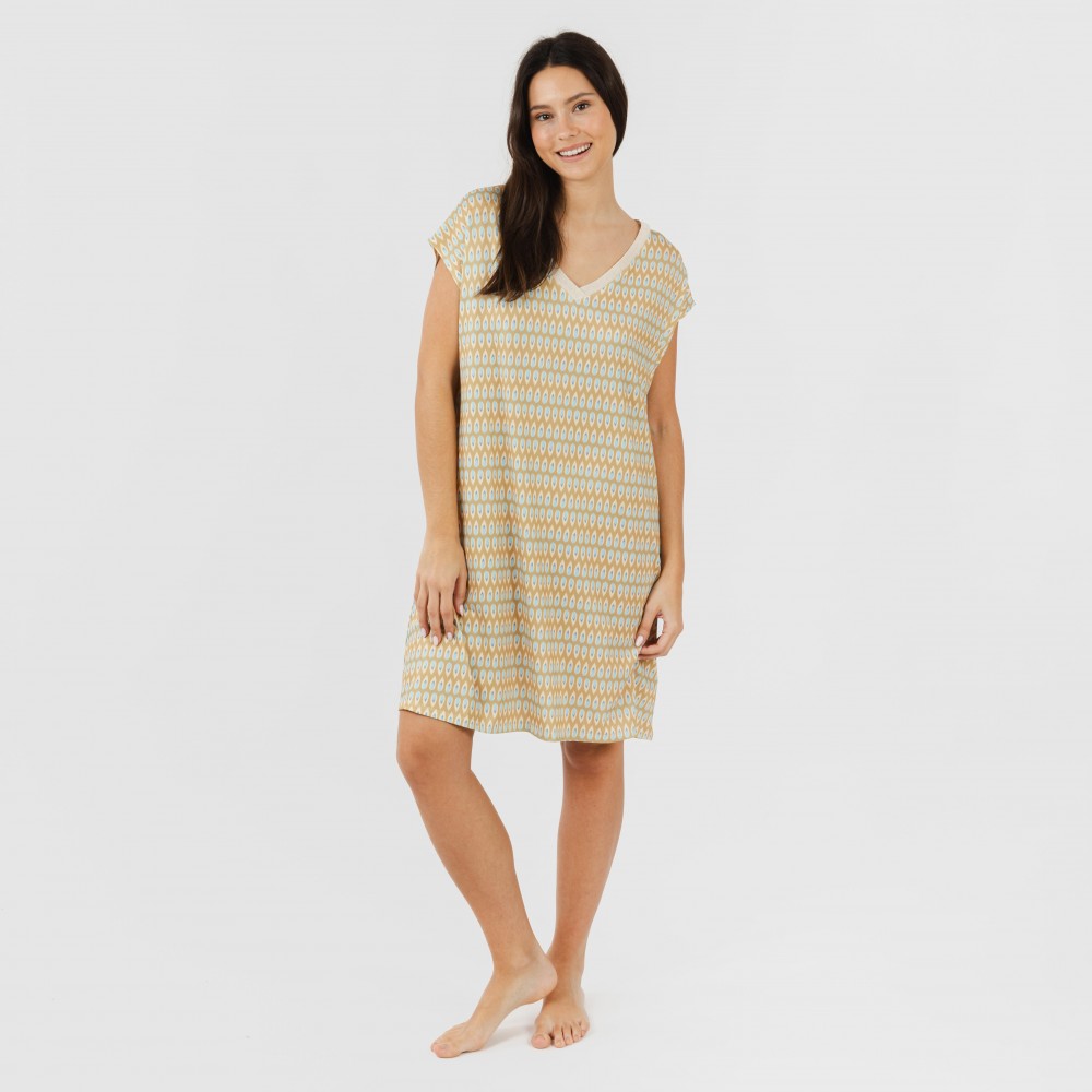 Vestido corto con manga fluida y escote en pico con detalle de color blanco brillante. Su diseño presenta un estampado de pequeñas gotitas en color azul y beige sobre un fondo arena.
