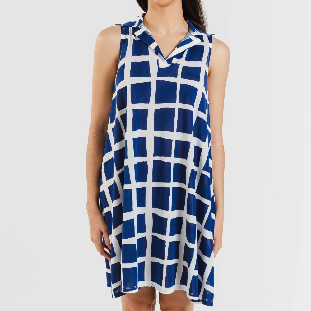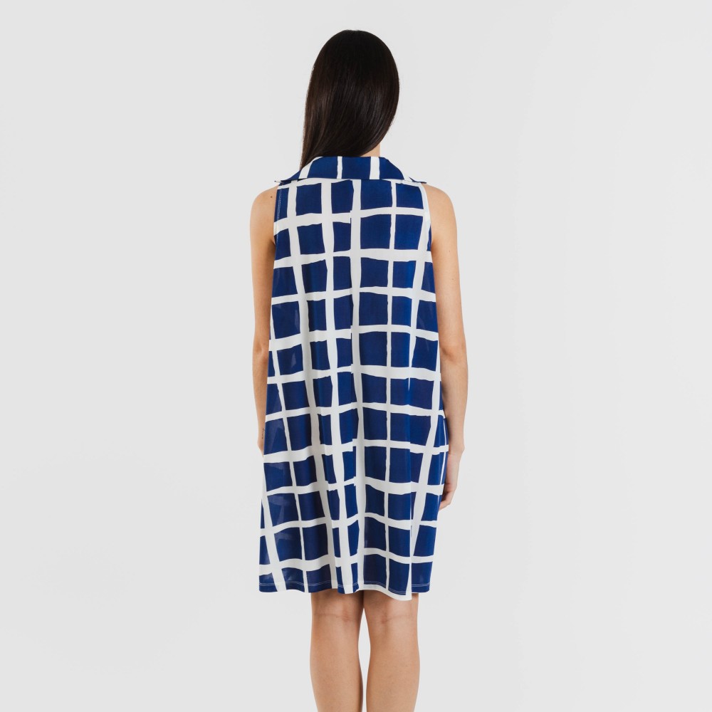 Vestido corto de tacto suave con cuello y solapa. Su diseño presenta un estampado de rayas horizontales y verticales de color blanco sobre un fondo azul marino.