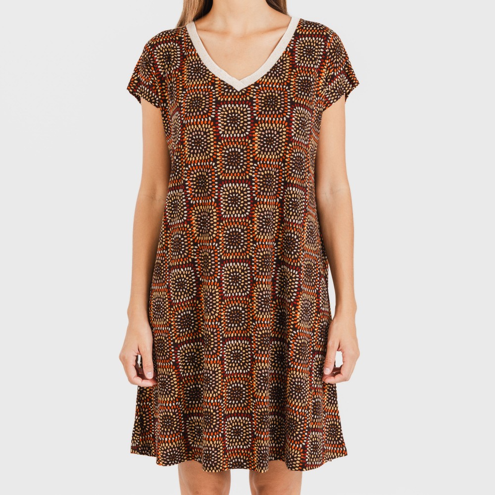 Vestido corto con manga fluida y escote en pico con detalle de color blanco brillante. Su diseño presenta un estampado en colores beige, teja, naranja, blanco y amarillo sobre un fondo marrón oscuro.