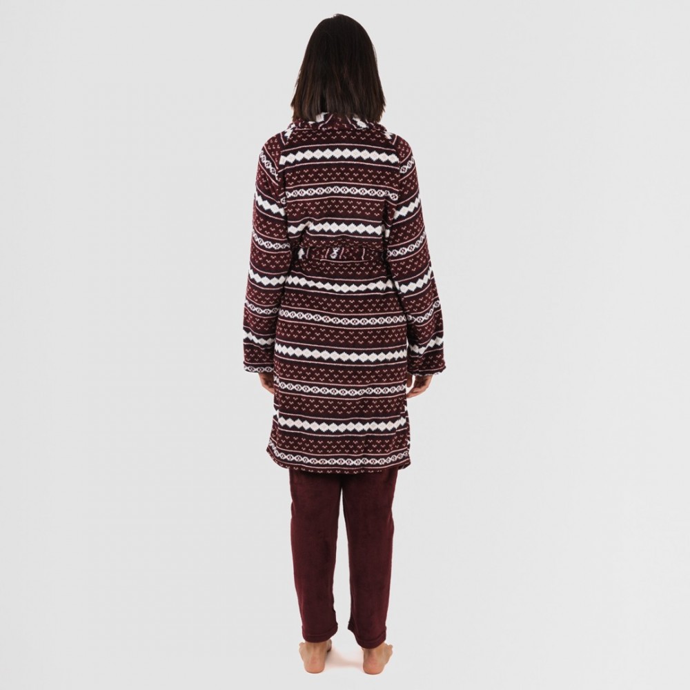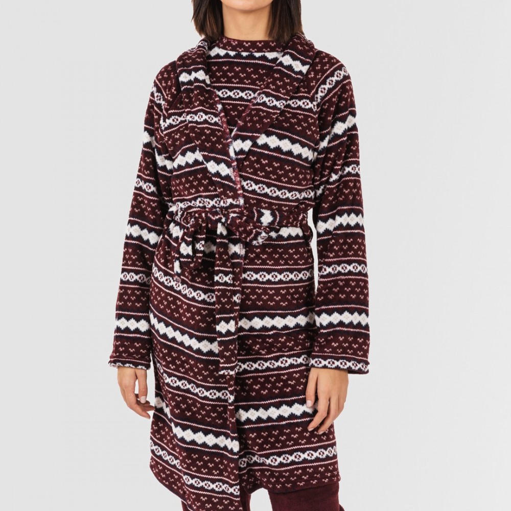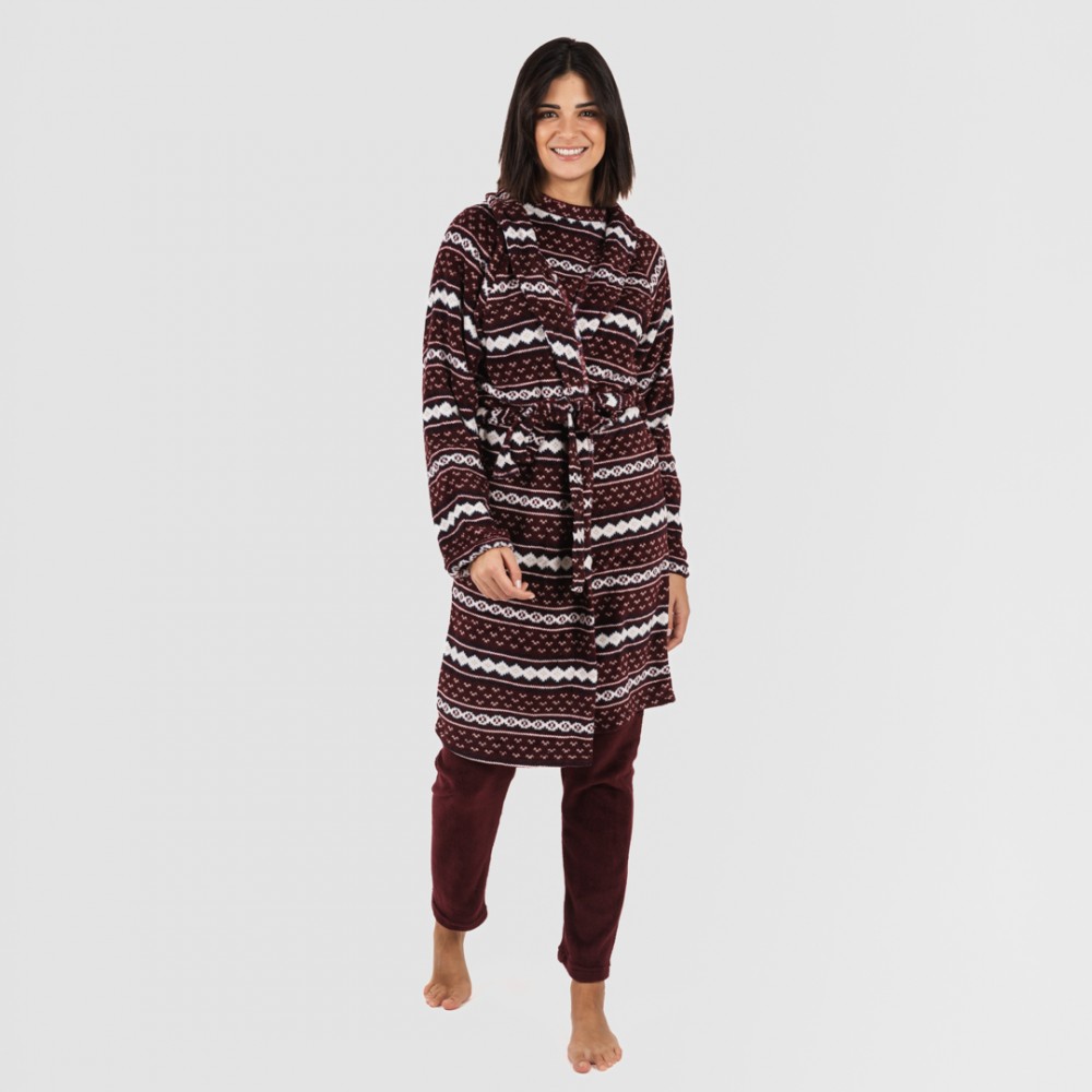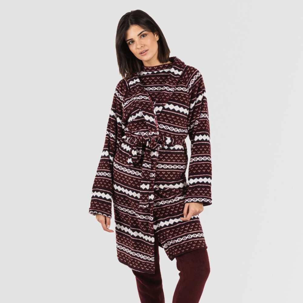 Presenta un estampado original de series geométricas de rayas y rombos en color blanco sobre un fondo rojo burdeos, fabricada con tejido de coralina muy suave, y ajustable con cinturón en los mismos tonos.