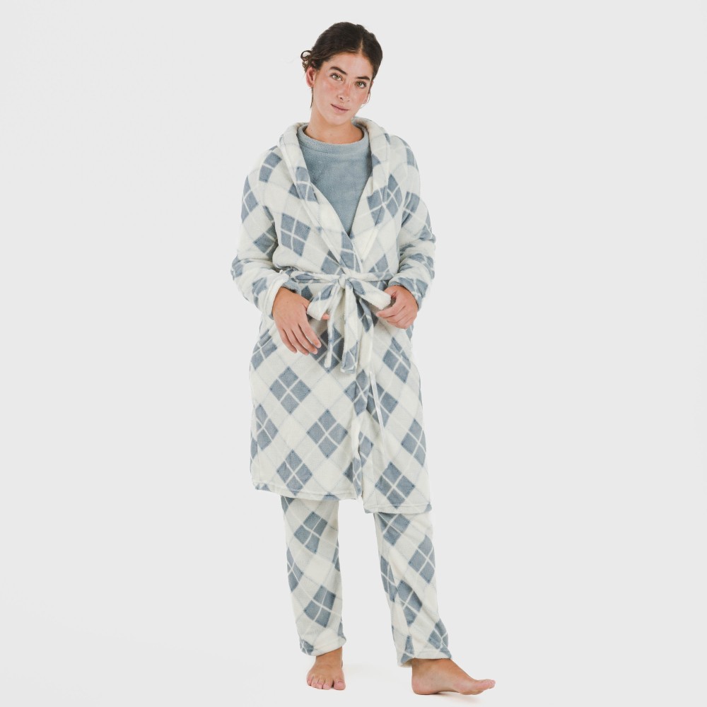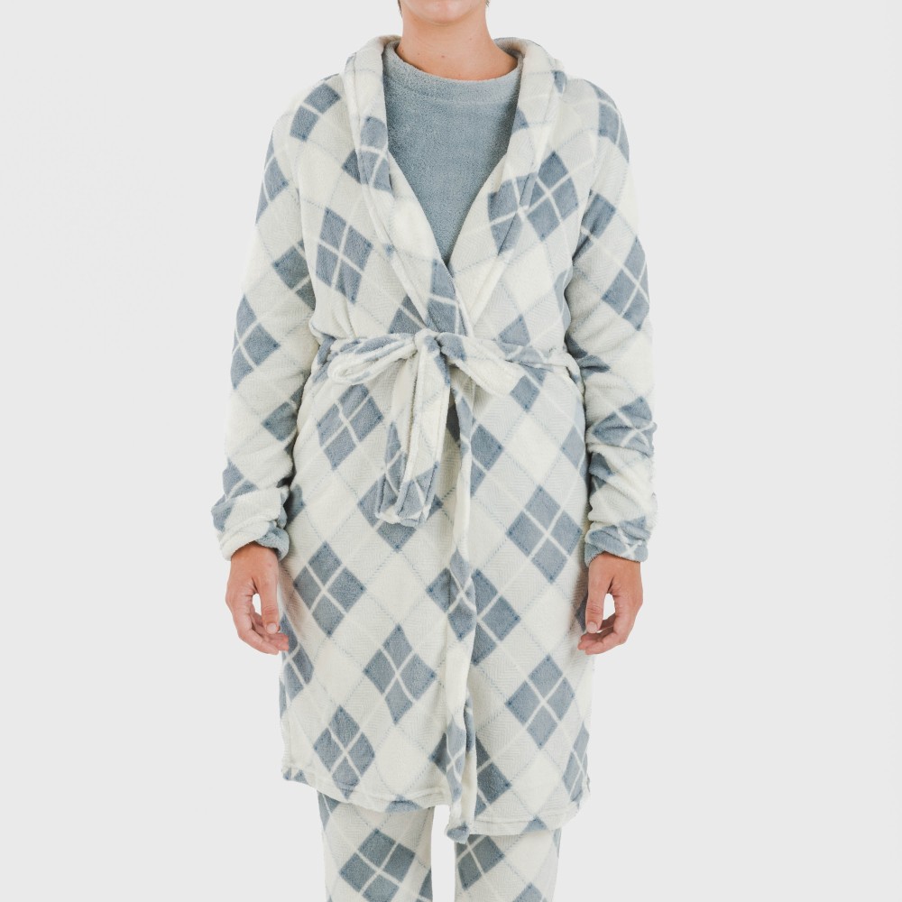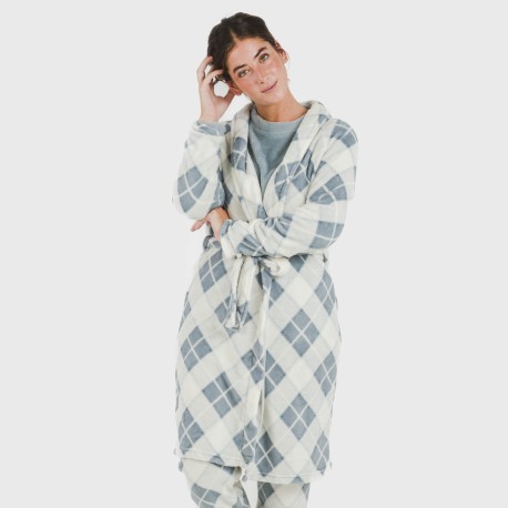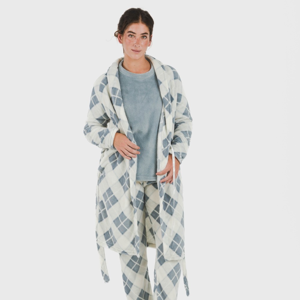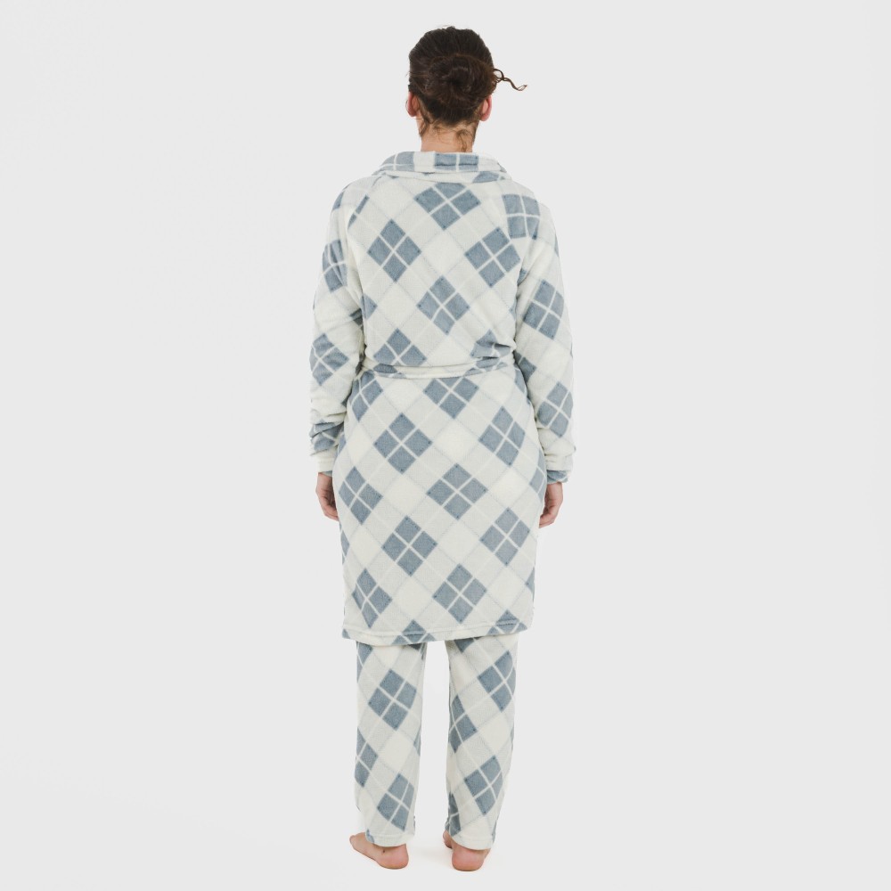 Bata con estampado de rombos azules sobre un fondo blanco, fabricada con tejido de coralina muy suave, y ajustable con cinturón en los mismos tonos.