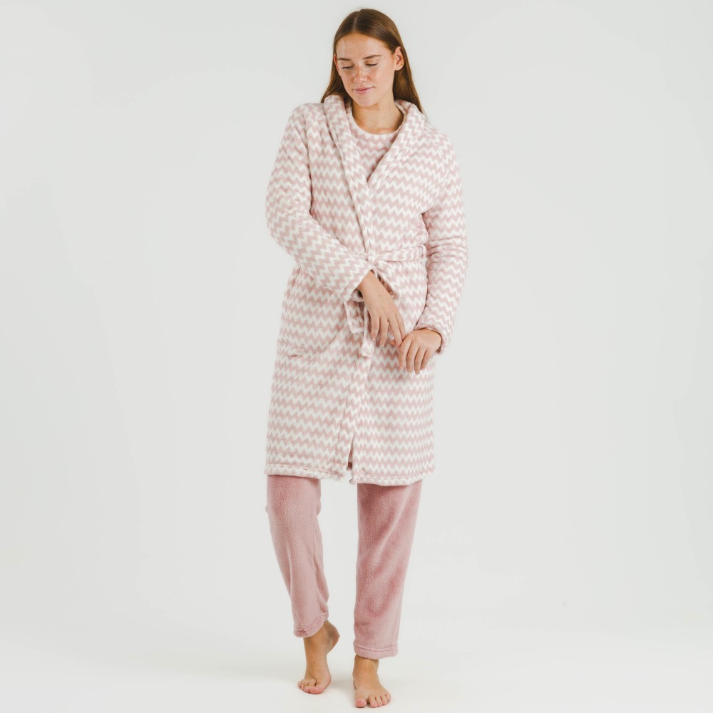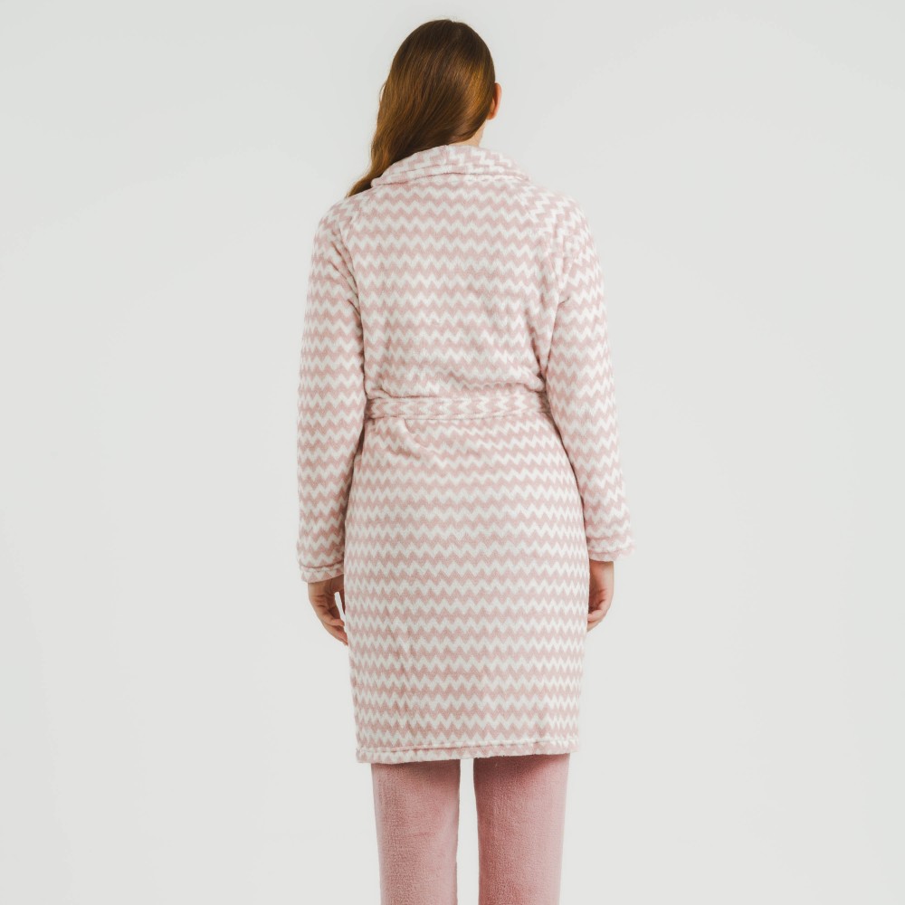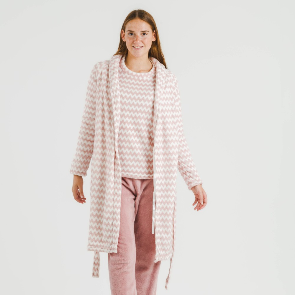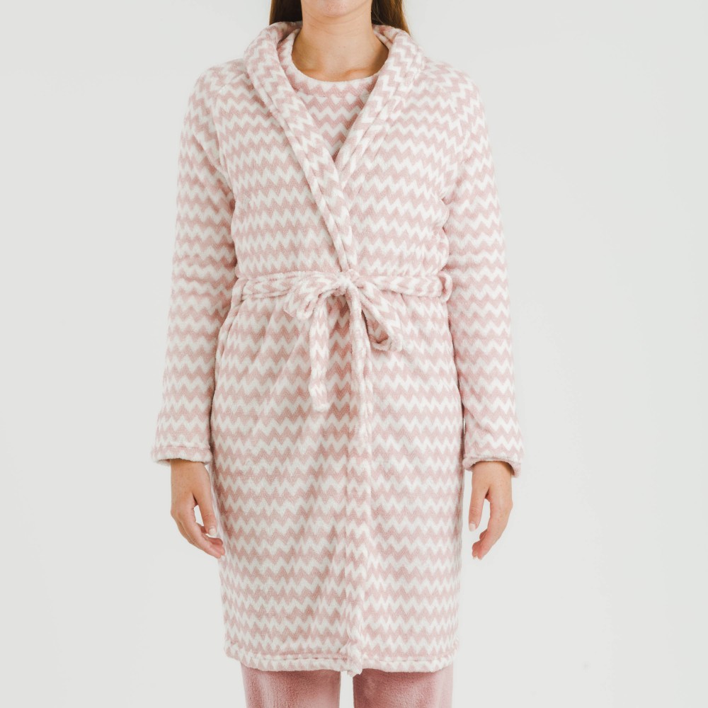 Bata estampada de zigzags en color rosa sobre un fondo blanco con tejido de coralina muy suave, y ajustable con cinturón en los mismos tonos.