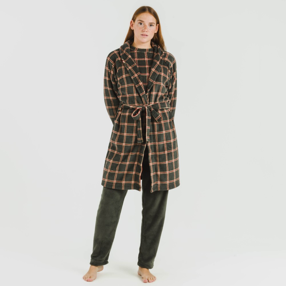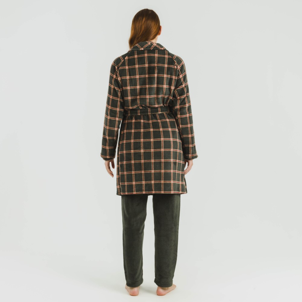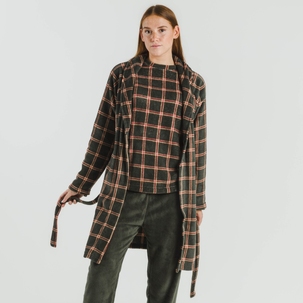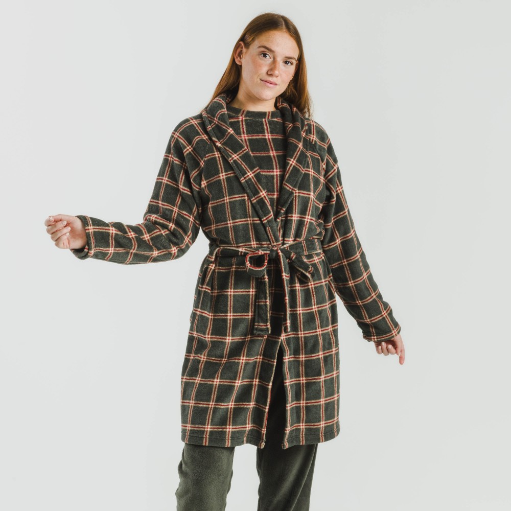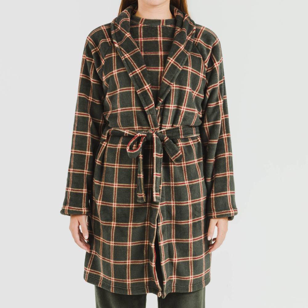 Bata estampada de cuadros rojos y beiges sobre un fondo verde cacería con tejido de coralina muy suave, y ajustable con cinturón en los mismos tonos.
