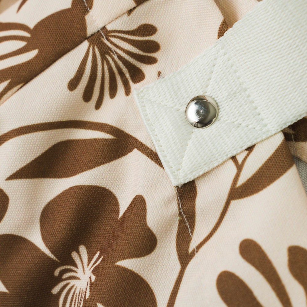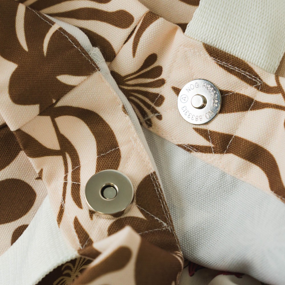 Bolso de playa con estampado de diferentes flores en tonos marrones sobre un fondo blanco.