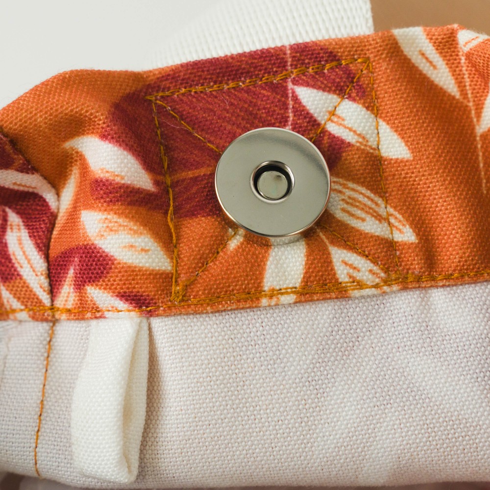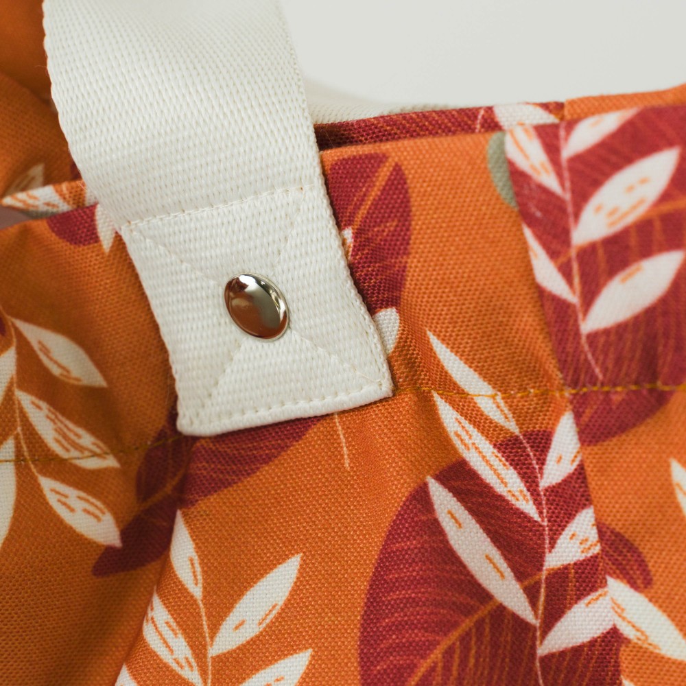 Bolso de playa con estampado de diferentes modelos de hojas en varios colores sobre un fondo naranja.