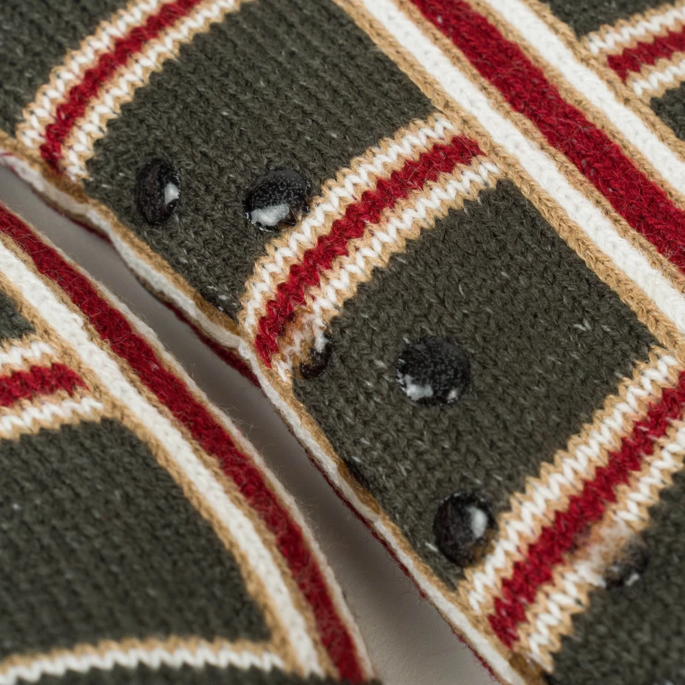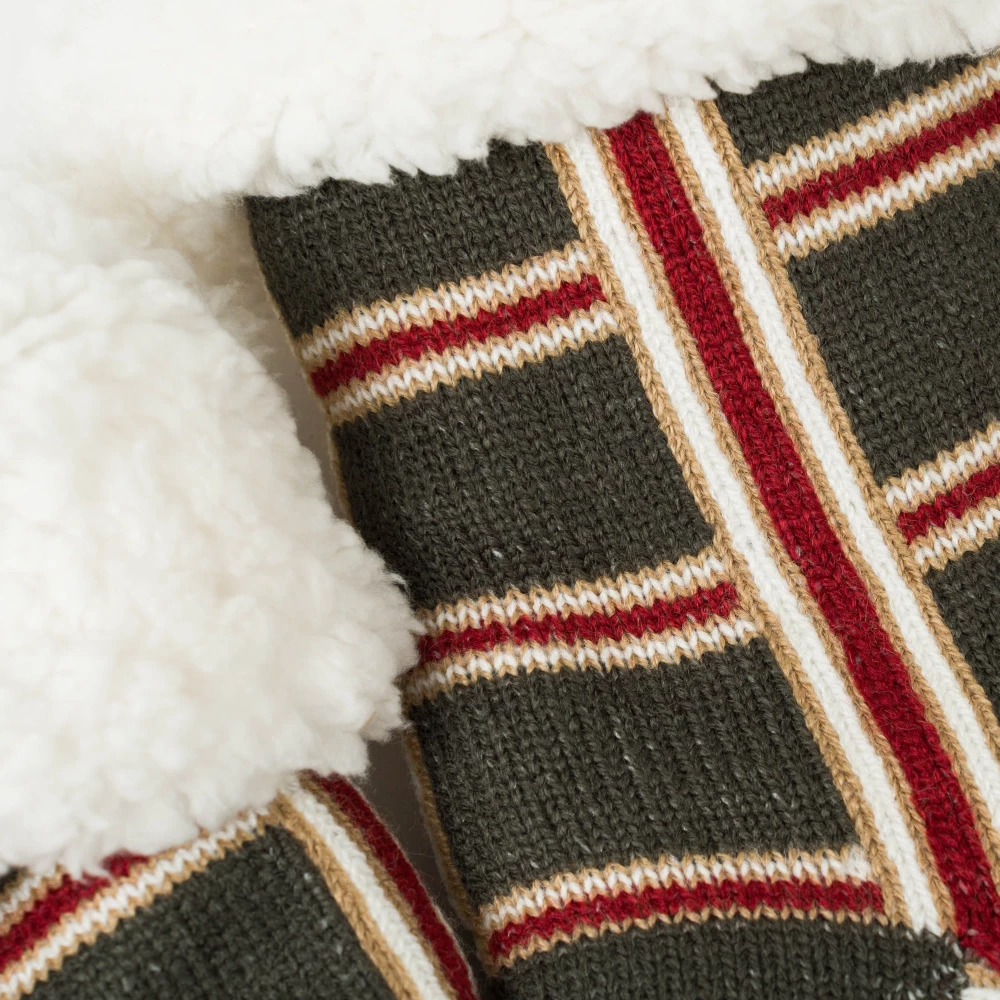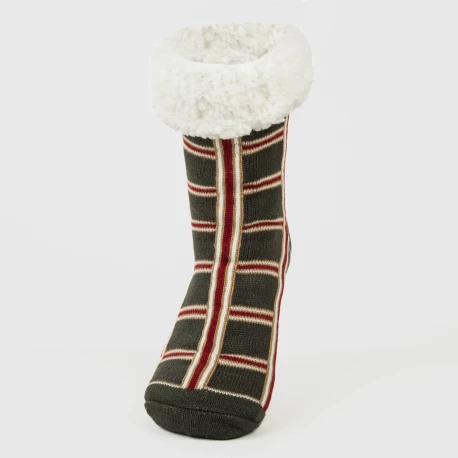 Calcetines térmicos de sherpa de color verde cacería con estampado de rayas y cuadros en tonos teja,arena y blanco, tienen agarres de silicona en la parte inferior que le permitirán andar con mayor seguridad por su suela antideslizante.