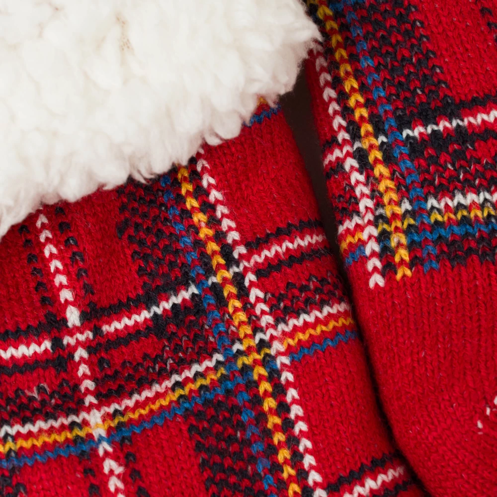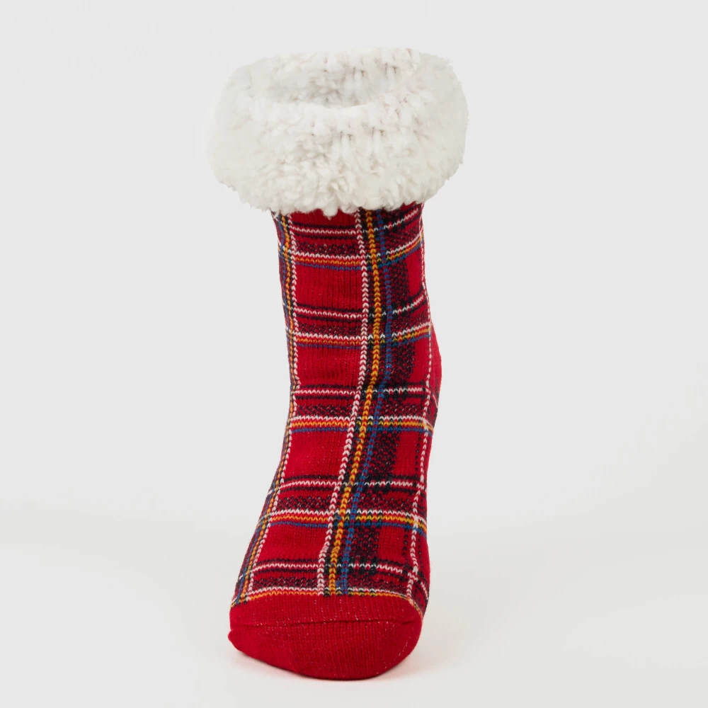 Calcetines térmicos de sherpa de color rojo con estampado de cuadros escoceses en tonos azules, blanco y amarillo, tienen agarres de silicona en la parte inferior que le permitirán andar con mayor seguridad por su suela antideslizante.