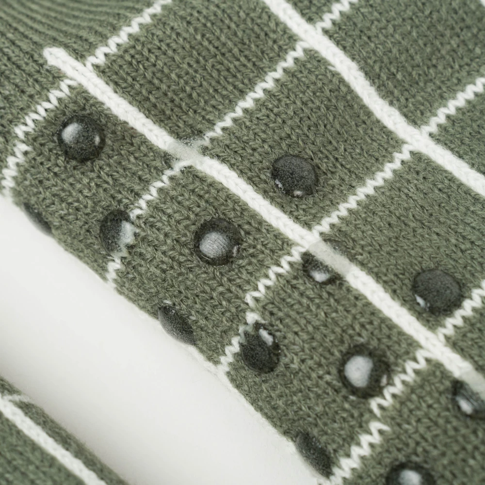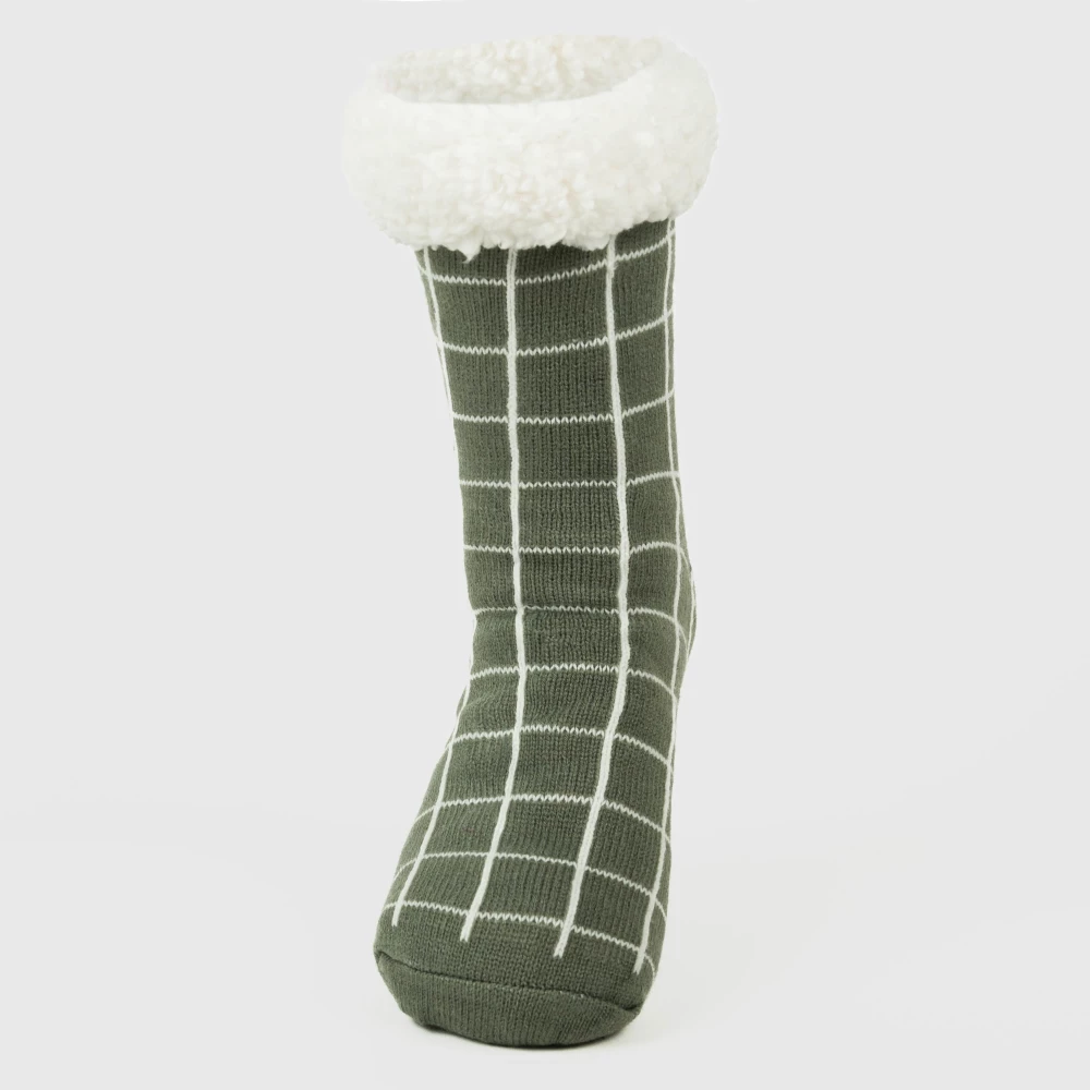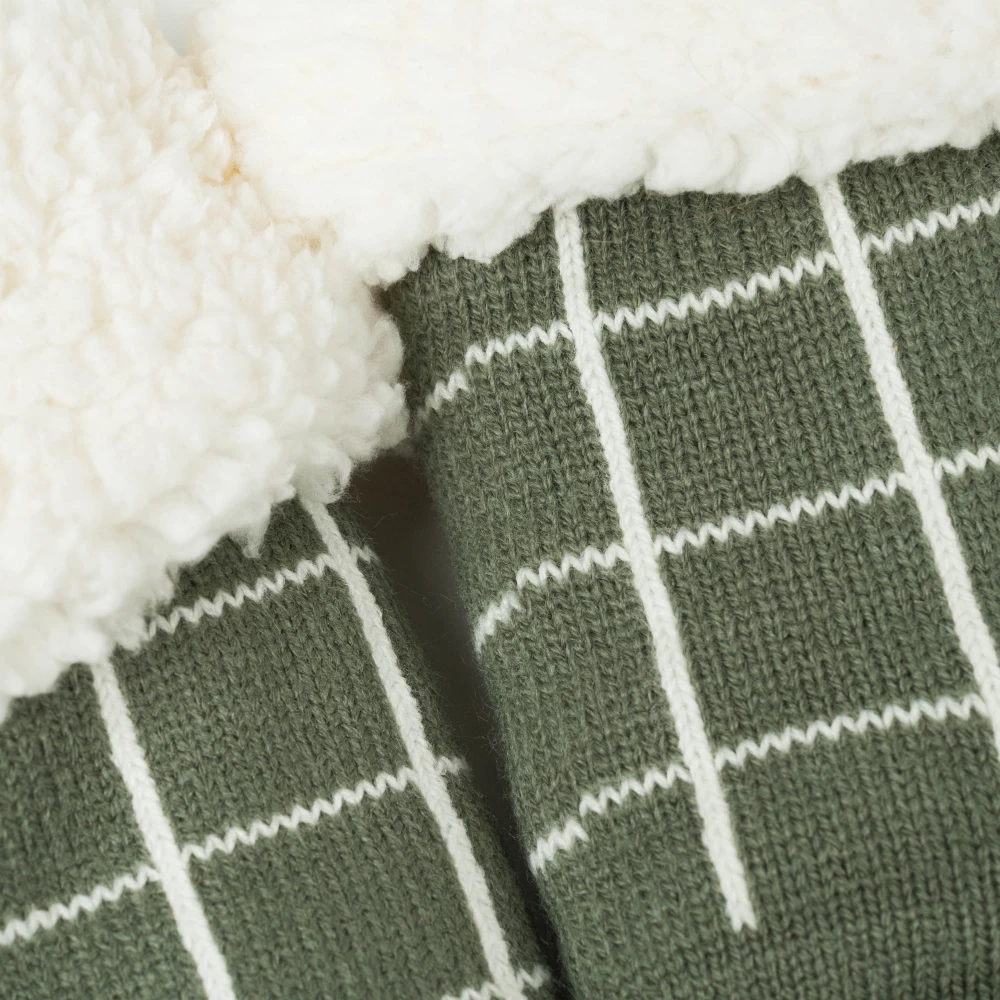 Calcetines térmicos de sherpa de color verde cacería con estampado clásico de rayas y cuadros blancos, tienen agarres de silicona en la parte inferior que le permitirán andar con mayor seguridad por su suela antideslizante.