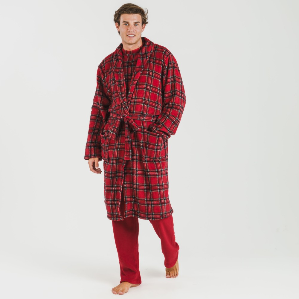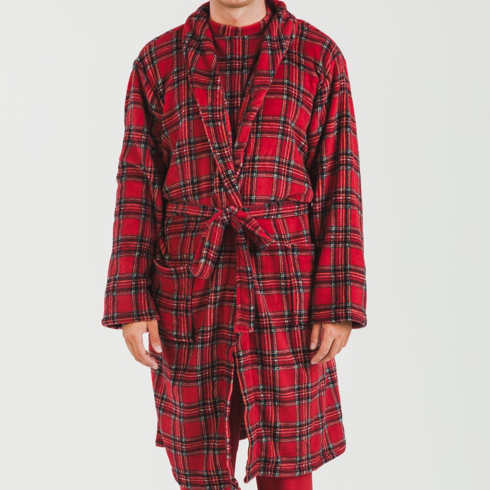 Bata de diseño clásico con cuadros escoceses rojo, fabricada con tejido de coralina muy suave y ajustable con cinturón.