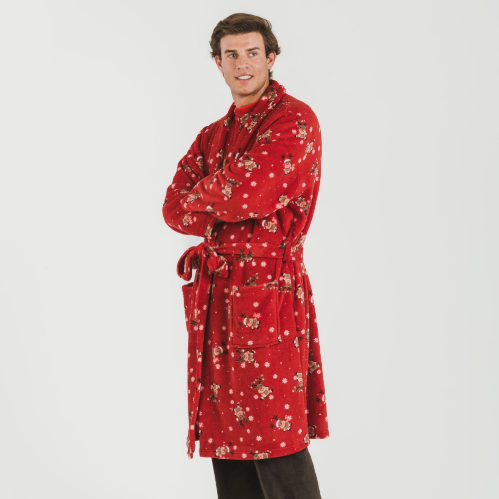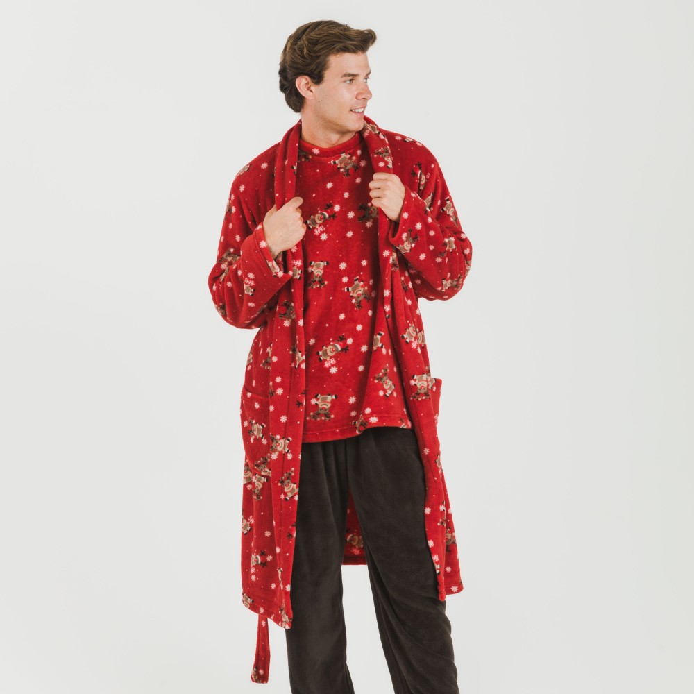 Bata de diseño navideño con renos y estrellas en tonos marrones y blanco sobre un fondo rojo, fabricada con tejido de coralina muy suave y ajustable con cinturón.