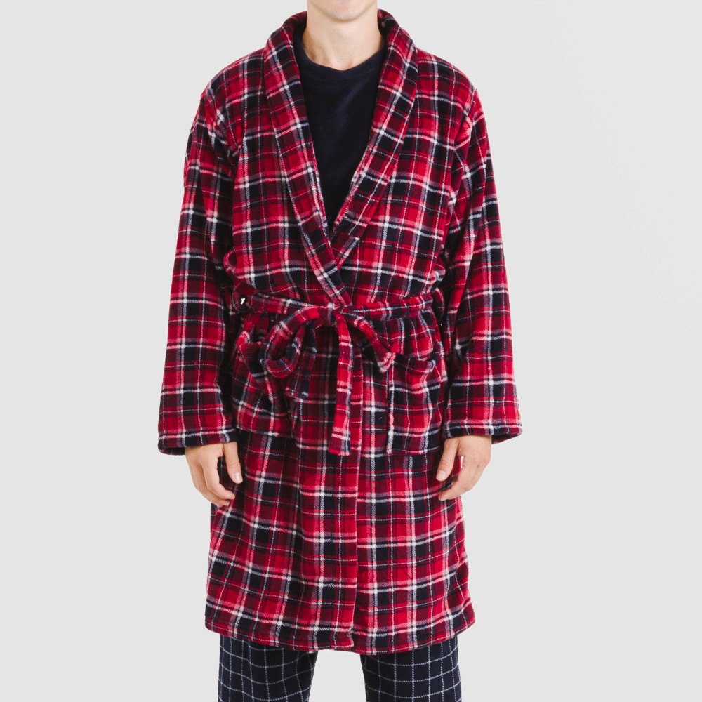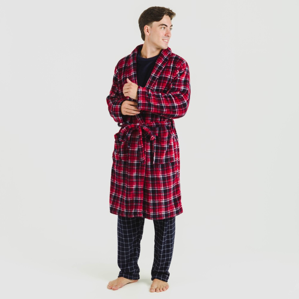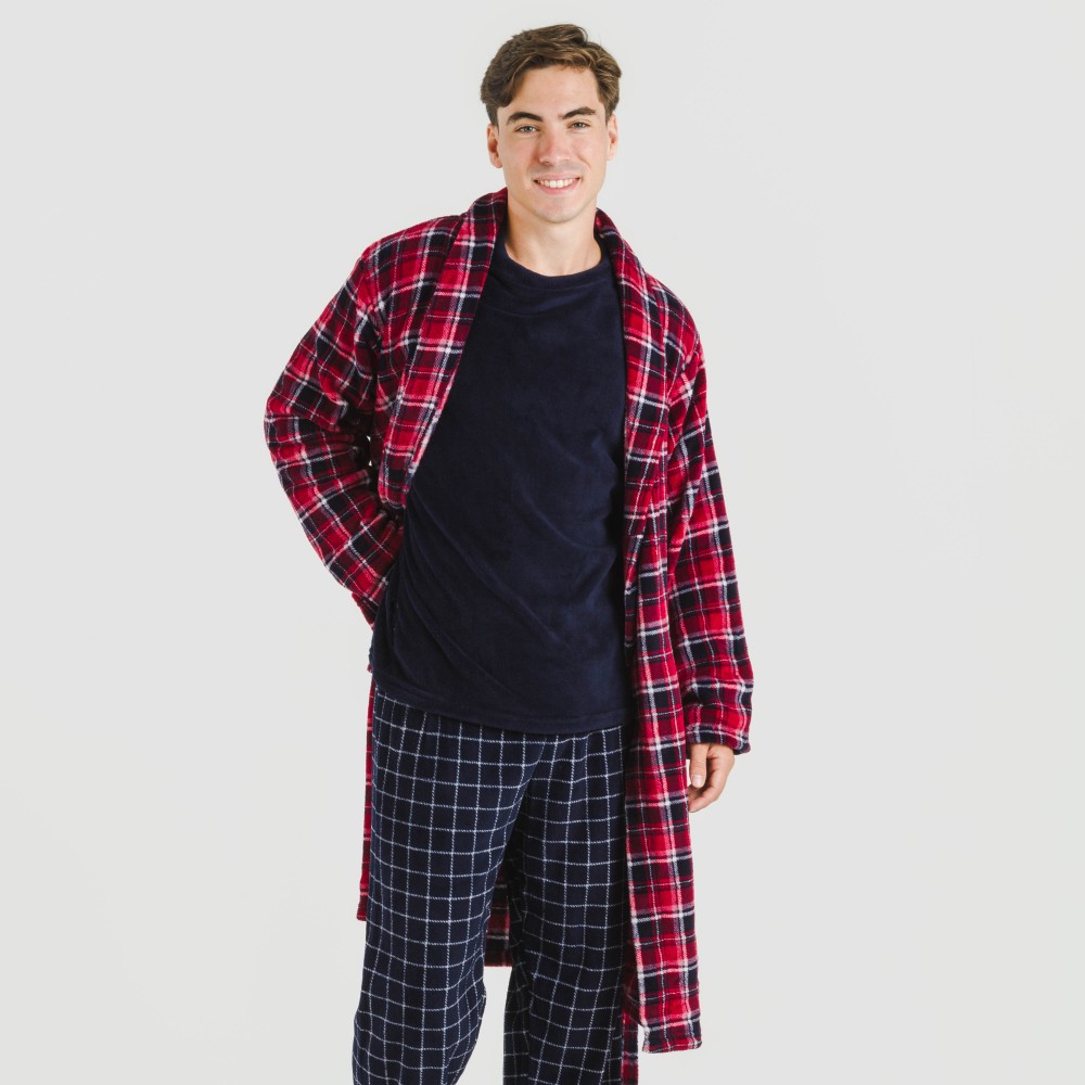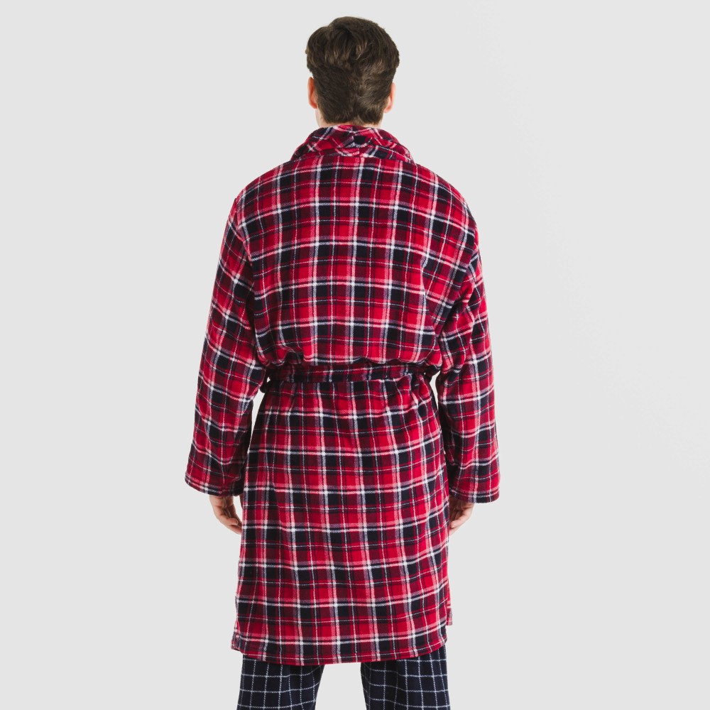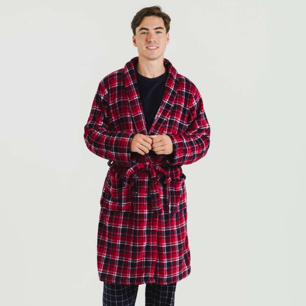 Bata de diseño clásico con cuadros rojos, azules y blancos, fabricada con tejido de coralina muy suave y ajustable con cinturón.