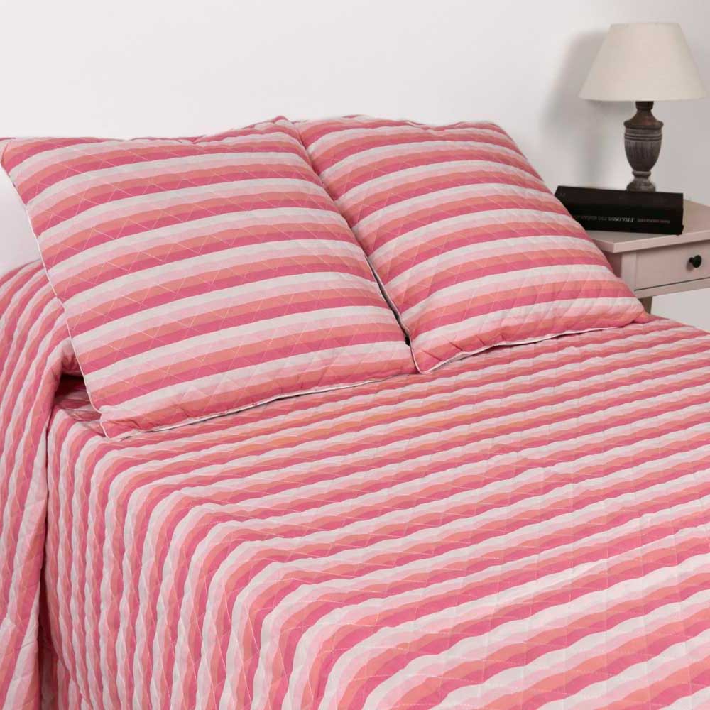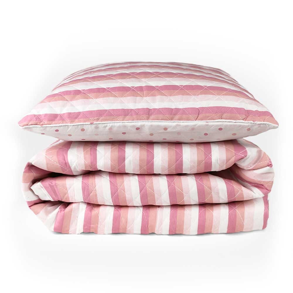 Colcha bouti Raya Nuria rosa con rayas horizontales en diferentes tonos de rosas sobre un fondo blanco, la cara trasera es de pequeños puntitos en los mismos colores sobre un fondo blanco